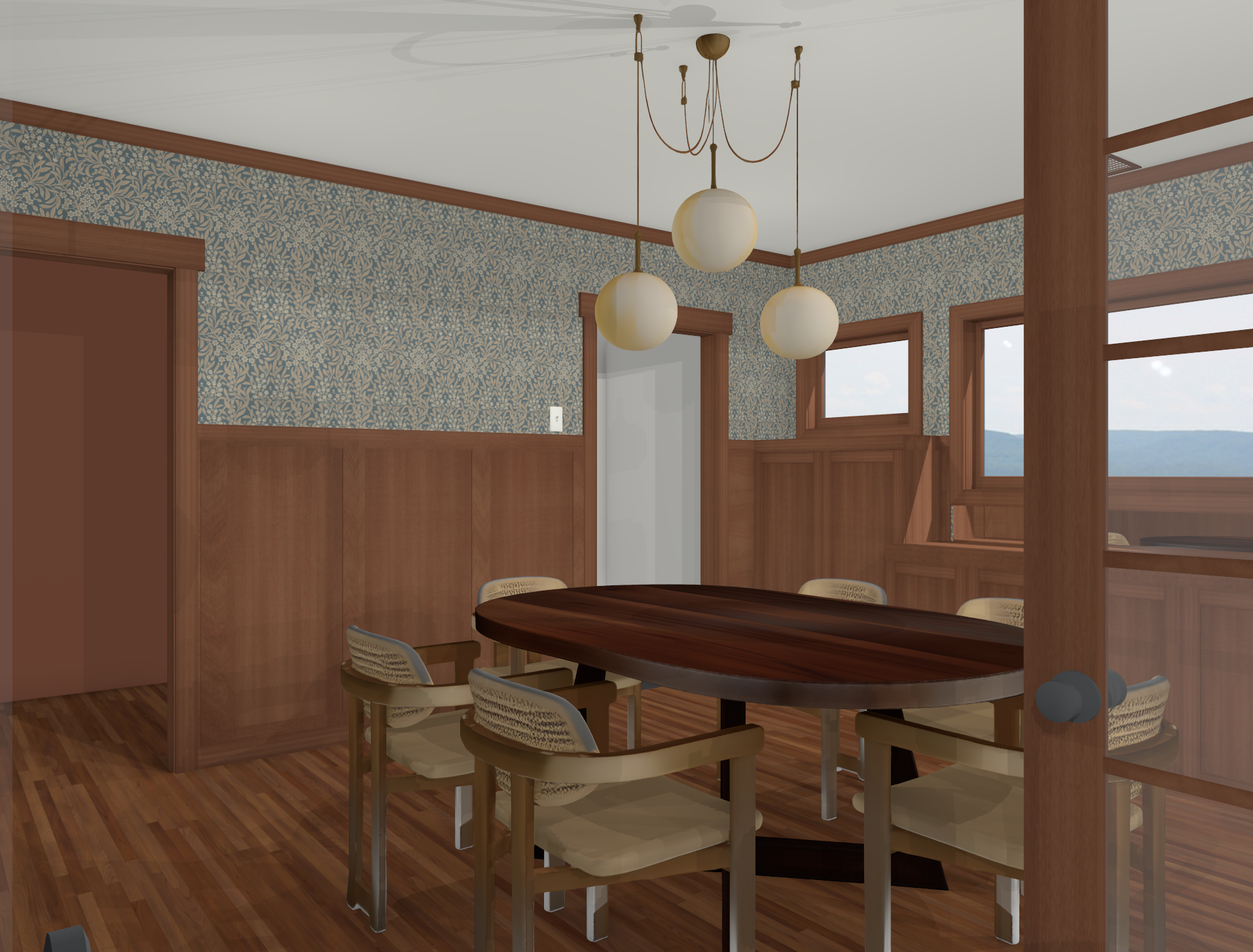 create a photorealistic rendering of this dining room in san diego with warm northern afternoon sun
