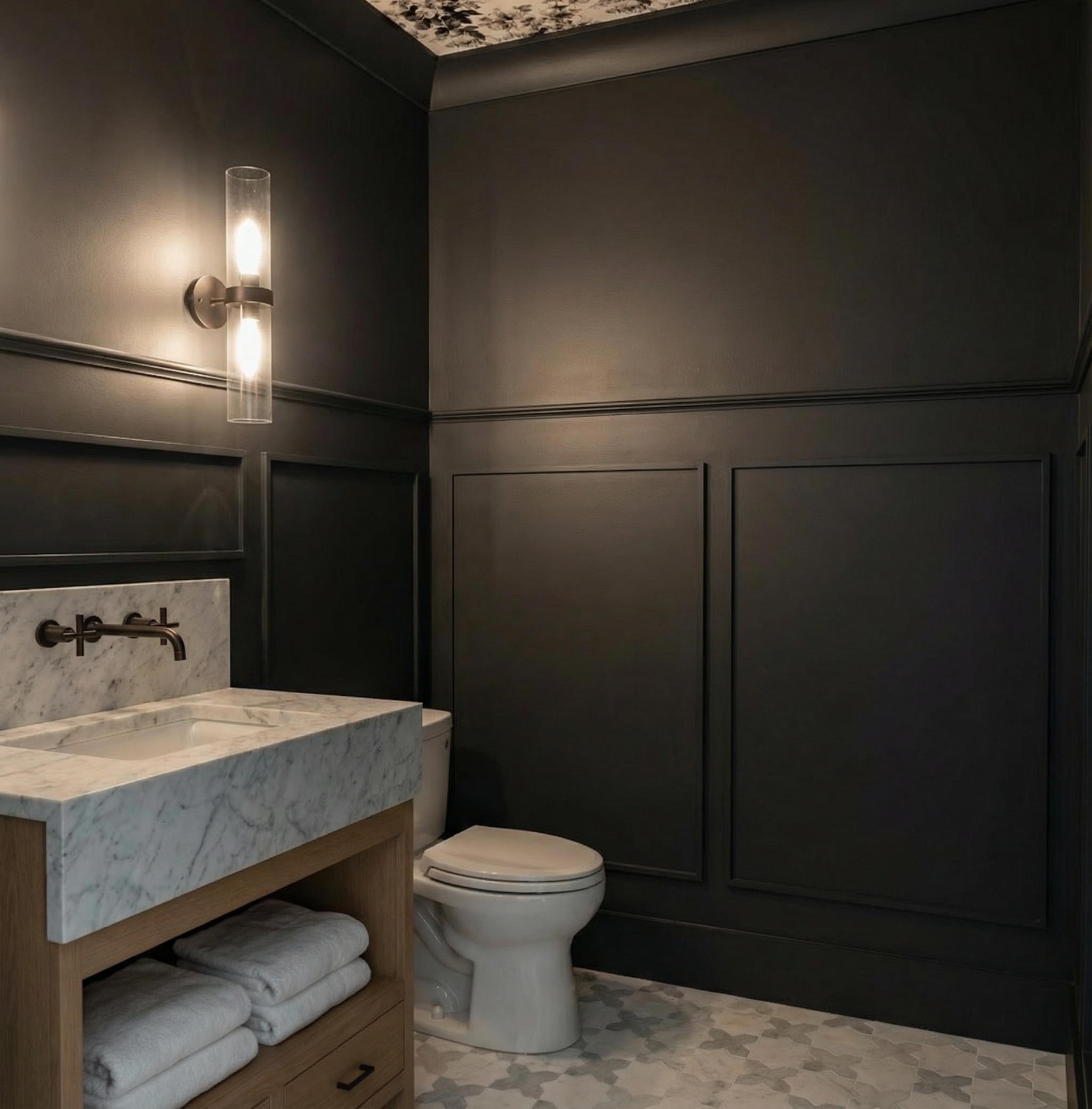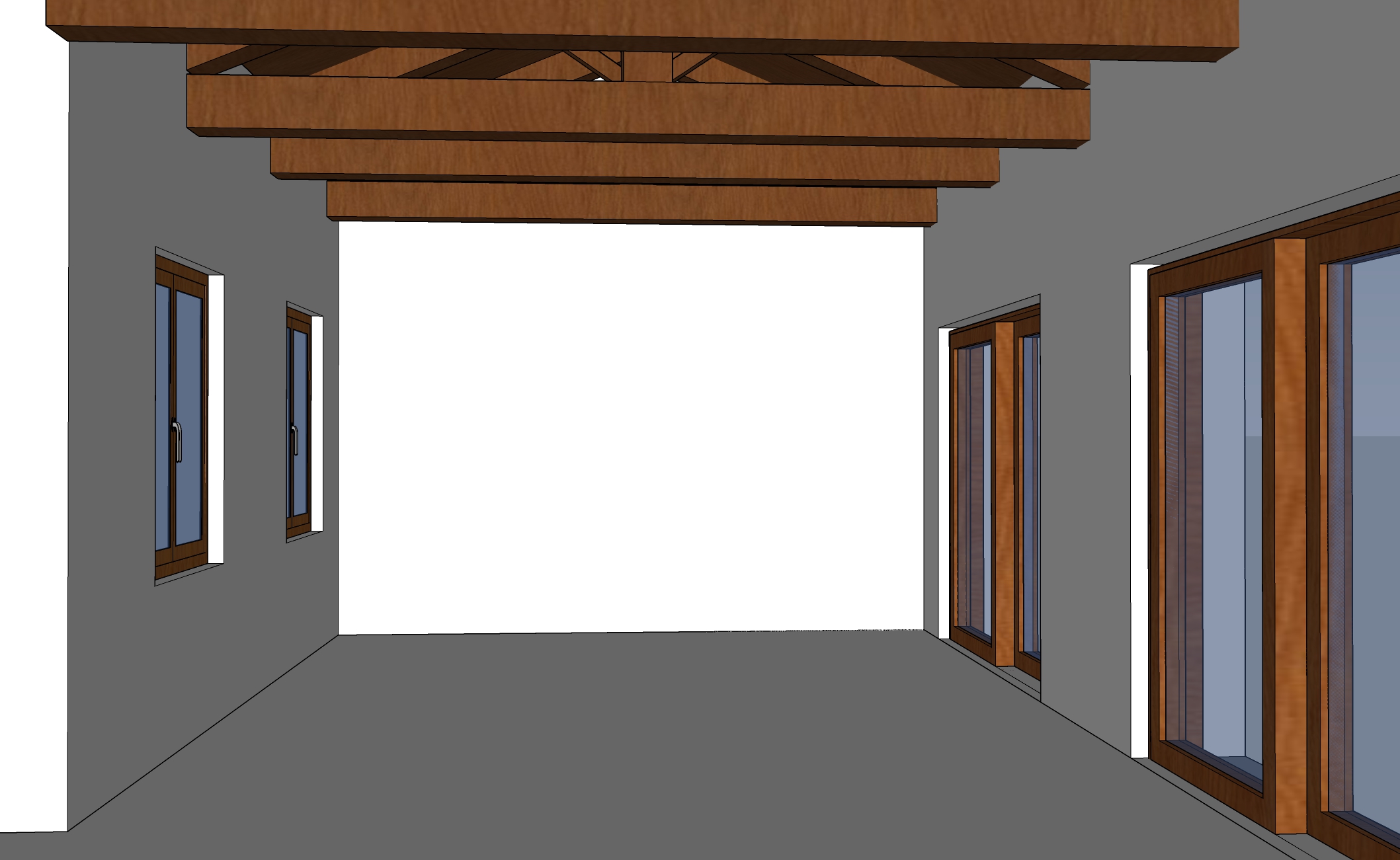large fireplace in the center of opposite wall dark wood for beams and windows dark grey stone walls wooden floors