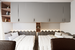 ultra realistic interior render enhancement preserve exact camera angle perspective layout and all furniture positions do not change geometry or proportions improve materials and lighting only sofas high end fabric upholstery soft matte finish subtle texture natural wrinkles realistic cushioning depth throw pillows varied premium fabrics linen boucle soft cotton slightly irregular placement for realism wood elements rich warm walnut tone visible natural grain matte satin finish no gloss cabinets smooth matte lacquer finish clean edges minimal reflections styling add tasteful minimal decor only on open shelves books small ceramic objects subtle accessories keep scene clean not cluttered maintain symmetry and balance of seating layout lighting soft natural daylight coming from left side diffused add subtle ambient fill light to avoid harsh shadows warm indirect led accents inside shelves for depth global illumination soft shadows realistic contrast rendering quality ultra high resolution photorealistic materials accurate shadows and reflections slight depth of field for realism important do not modify sofa design layout wall structure or cabinet positions only enhance realism materials lighting and styling