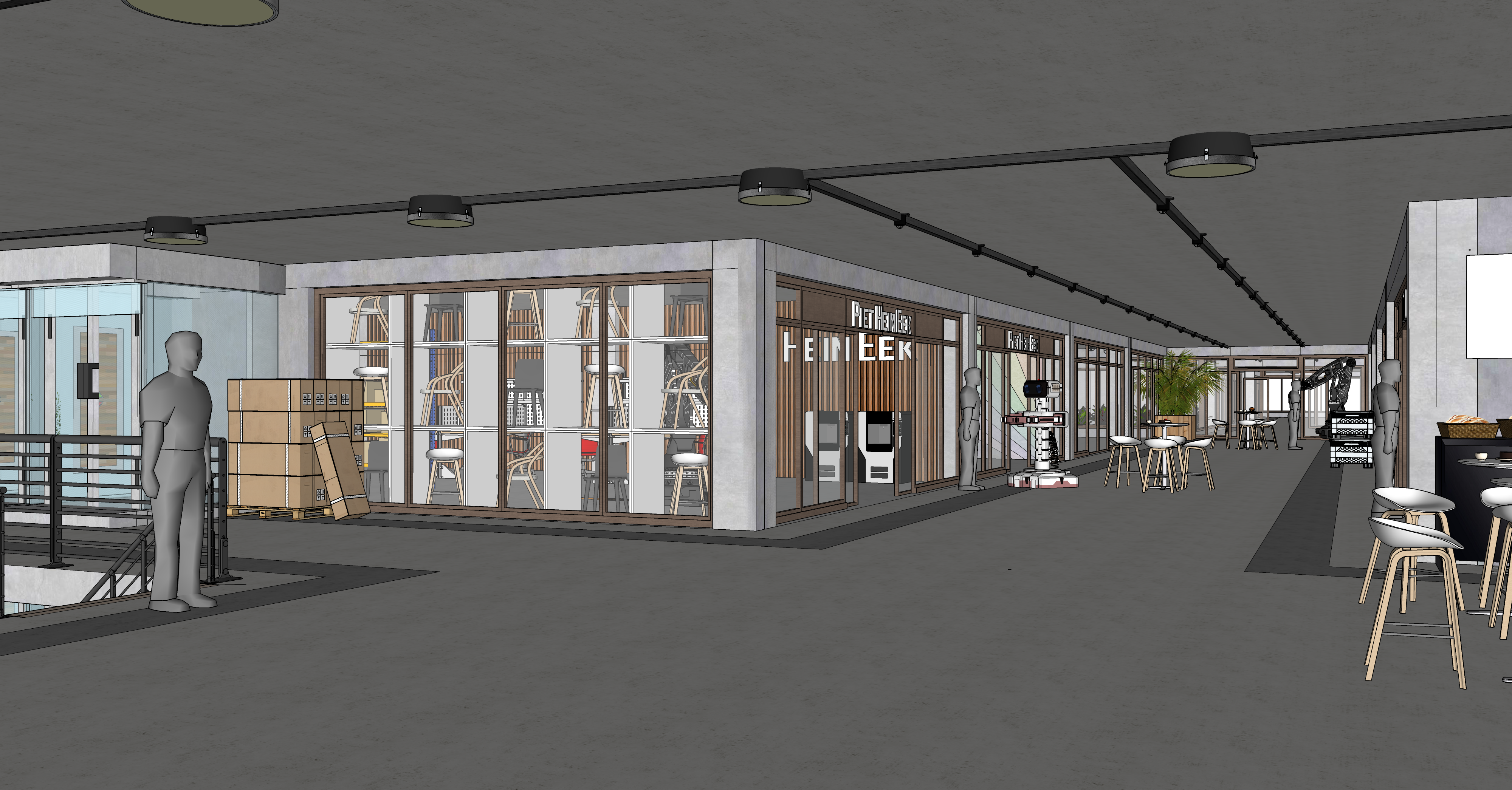 modernist interior shot industrial coworking space wooden details white walls concrete floor light ambience architecture