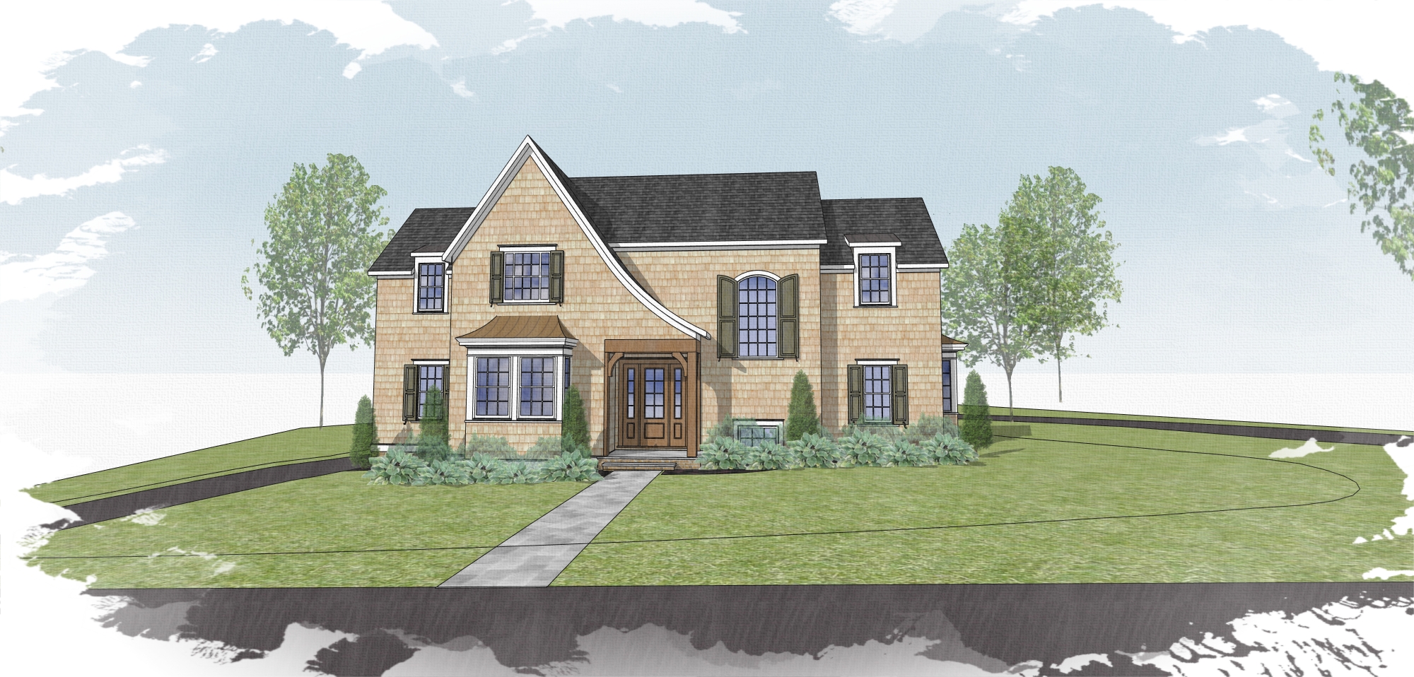 shingle siding with full bright landscaping