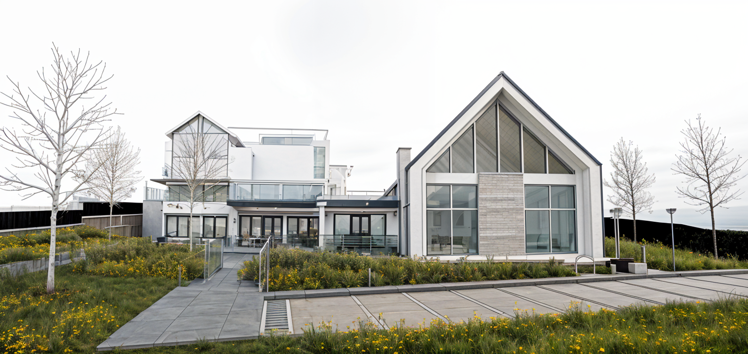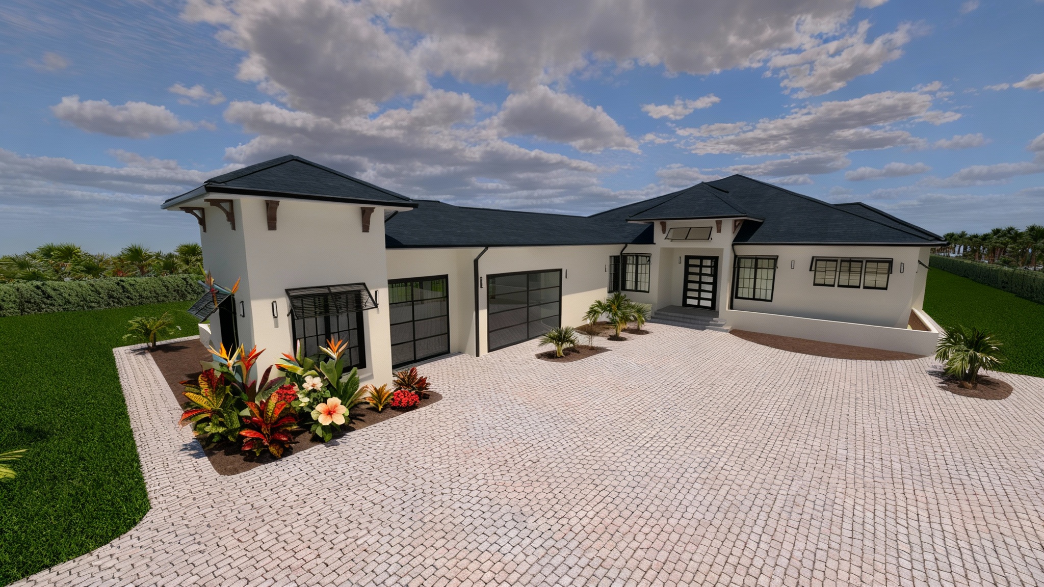 do not modify or alter anything in the attached image only add realistic decorative tropical landscaping plants inside the existing soil areas keep the house driveway sky shadows lighting materials and all other elements exactly the same do not add any palm trees