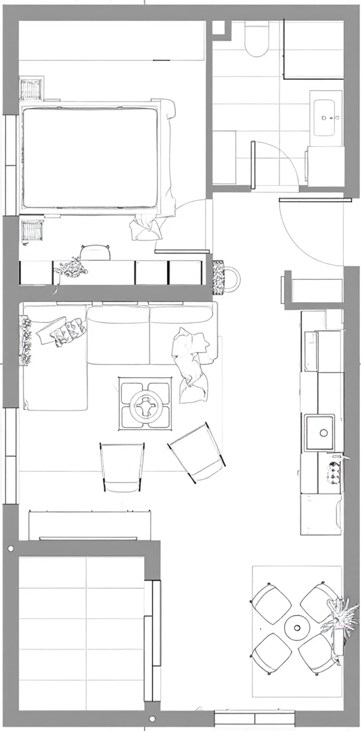 render a modern living room with a cozy warm atmosphere use light oak for the wooden beams and shelves the walls should be a crisp white contrasting with a textured light gray for the fireplace wall the television is mounted above the fireplace with a subtle black frame include a light oak mantelpiece the floor is a rich dark walnut wood the sliding door has a sleek black frame soft ambient lighting creates a welcoming feel prioritize natural material textures and subtle harmonious color contrasts shelving to be white add fire to fireplace