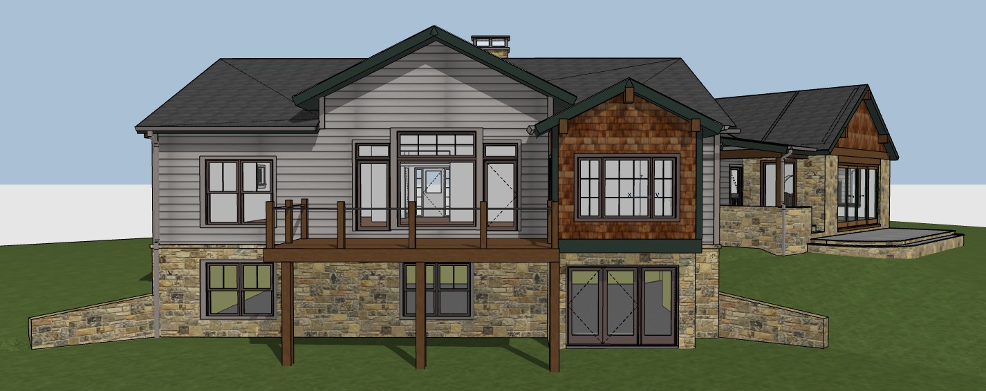 make photorealistic warm gray siding gable and bay trim dark green window trim same warm gray color as siding keep stone the same light landscaping trees and low mountains in background