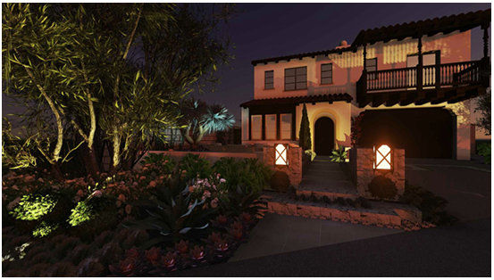 create a serene nighttime scene of a two story mediterranean style house with a terracotta tiled roof and white stucco walls the house is warmly illuminated showcasing gentle amber and soft white lights in the foreground a lush garden is filled with a variety of plants including succulents and tall trees which are highlighted with subtle green and amber uplighting the pathway is framed by stone columns topped with glowing lanterns adding a cozy and inviting feel the sky is a deep twilight blue enhancing the tranquil and harmonious ambiance of the setting