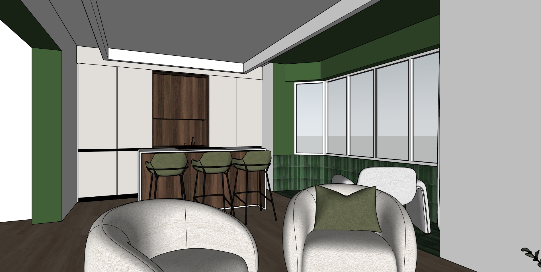 crea una imagen fotorrealista a partir de este sketchup a ade cortinas en la zona de ventana