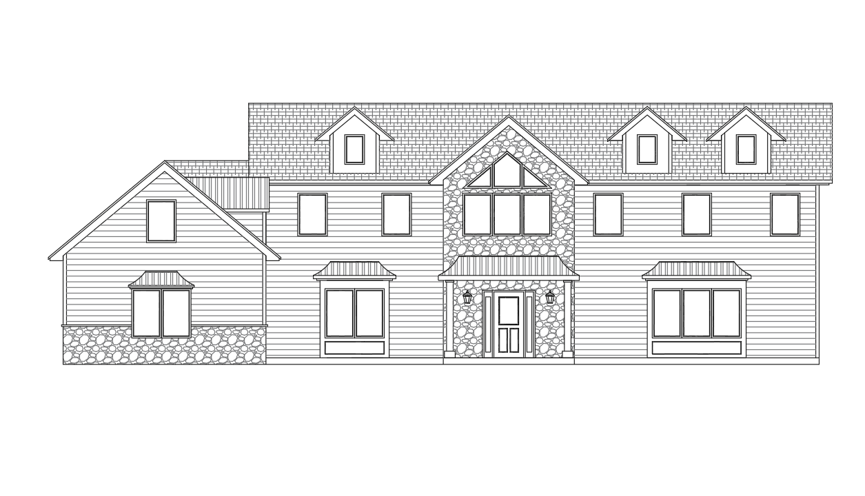 the exterior features light beige siding complemented by matching light beige stone veneer the primary roof is finished in dark gray asphalt shingles with select accent roof areas in metal large bright windows with white trim provide crisp contrast and are designed without grids for a clean contemporary appearance the front entry door is finished in a rich dark wood tone the residence is situated within a well maintained landscape of lush green lawn and understated tasteful plantings with minimal floral elements warm interior lighting gently glows through the windows the setting captures a pleasant afternoon ambiance enhanced by soft glare from the afternoon sun creating depth and natural warmth throughout the scene
