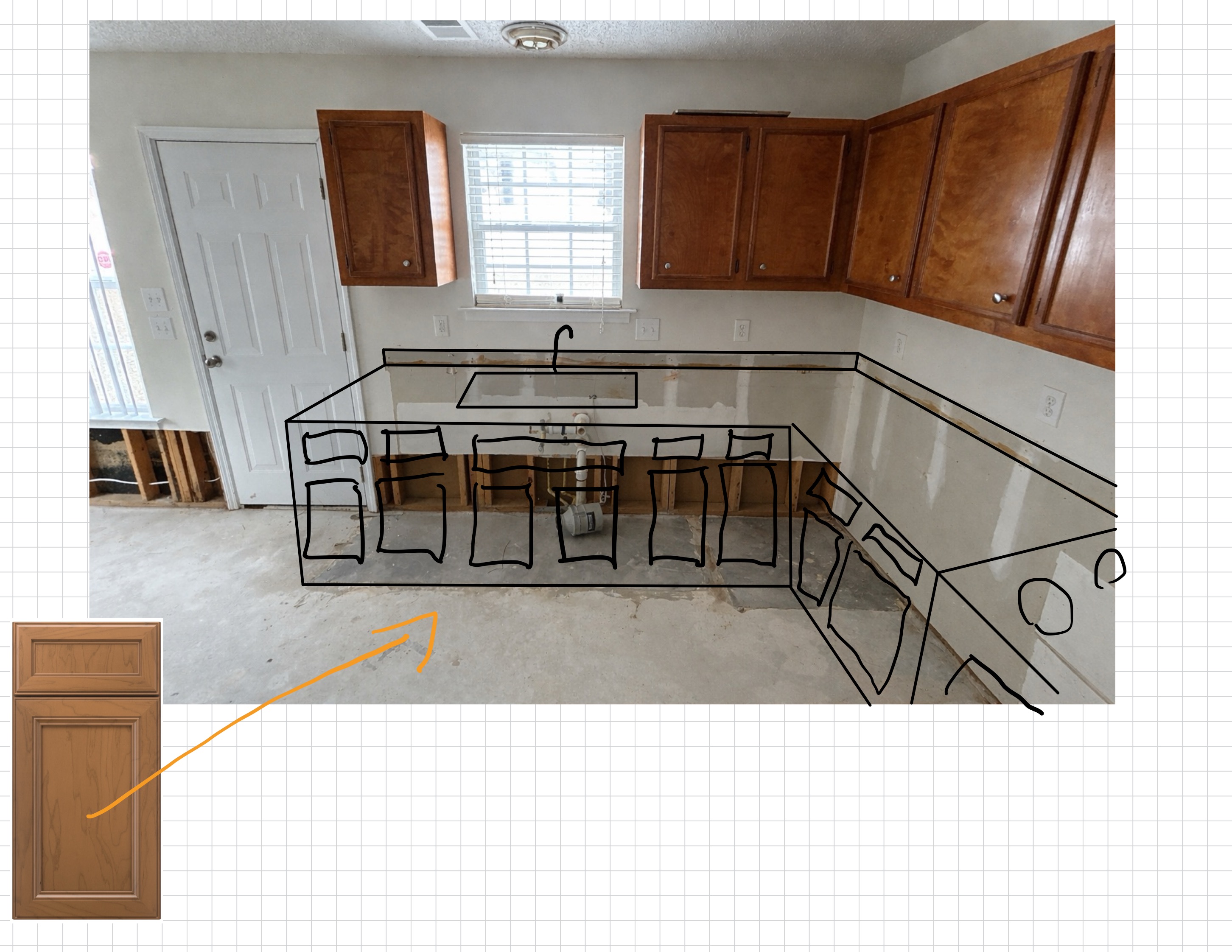 use this cabinet face and color to finish filling in the base cabinets in this kitchen the countertops will be a bluish gray laminate with a rounded edge and there will be no backsplash just painted wall a stainless steel sink