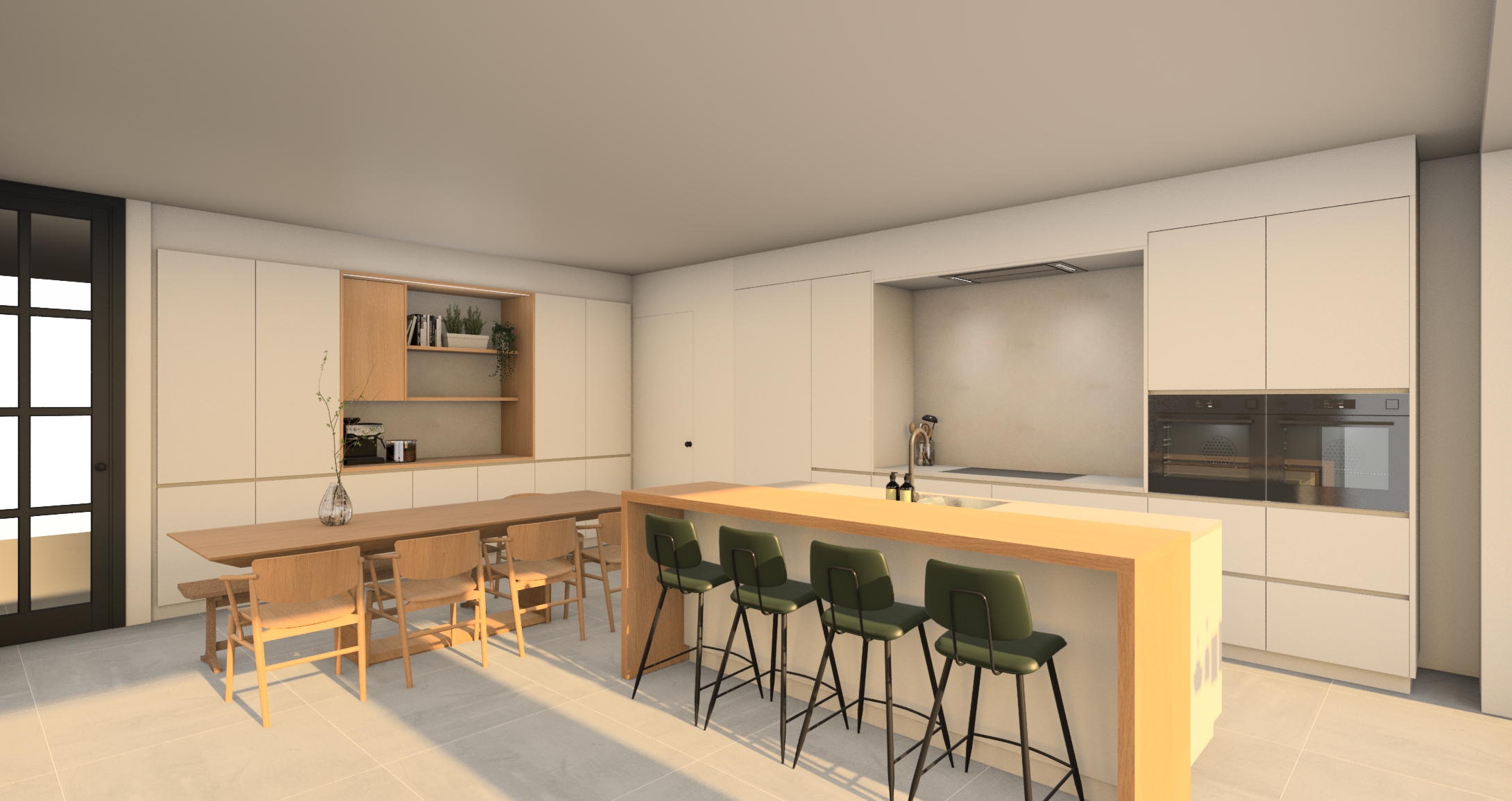 enhance this photo of a kitchen into a professional interior image optimize the lighting so the space appears bright natural and inviting with soft realistic light entry and balanced shadows subtly increase sharpness and clarity correct white balance and colors so that materials such as wood stone metal and lacquer appear true to life and luxurious ensure the overall look is sleek stylish and high end without changing the layout furniture or architecture maintain a realistic appearance refine contrast and details reduce noise and give the photo a warm elegant interior style like in a premium kitchen catalog