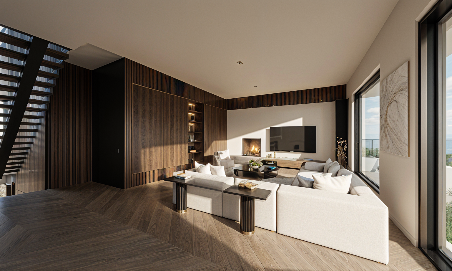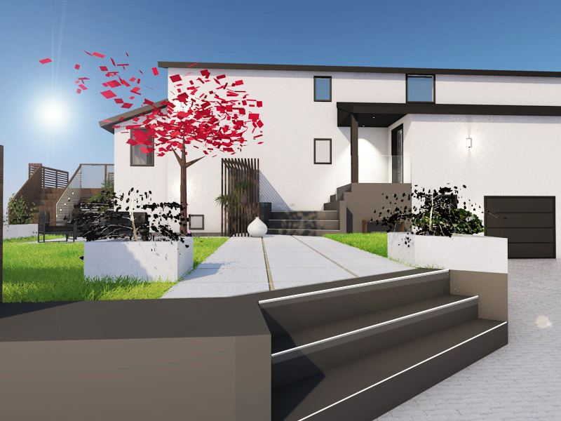 generate a realistic image of a modern house exterior with a minimalist design the house features sleek white walls with black window frames and trims in the foreground a red leaved tree with dynamic falling leaves stands against the backdrop of a bright blue sky and radiant sun creating a warm and inviting atmosphere the gray stone pathway leads to the entrance flanked by well manicured green grass on both sides modern outdoor stairs in dark gray lead up to the house with subtle garden lights enhancing the welcoming ambiance include contemporary outdoor furniture on a wooden deck in the background to complete the serene setting