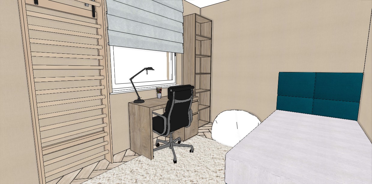 the rendered image should feature clean natural daylight as the dominant light source with soft diffused daylight entering through large openings the lighting should be well balanced avoiding excessive contrast or overexposure while ensuring that details remain clearly visible even in shaded areas the scene should also include 4000 kelvin interior artificial lighting the neutral white tone of this lighting should harmoniously complement the daylight the artificial light must not dominate the scene it should subtly enhance spatial depth and highlight material textures colors must remain accurate and natural with no color shift toward warmer or cooler tones the white balance should be neutral and the render should faithfully represent the original material finishes and shades the overall image should be clean sharp and photorealistic matching the original design as closely as possible in terms of composition proportions and material representation avoid excessive post processing oversaturation or stylization the goal is a realistic and authentic visual presentation make the wall color slightly darker brown the bean bag should have a football soccer ball pattern place a few decorative accessories on the shelving unit adjust the color of the wall bars swedish ladder the desk and the shelving unit to match the original image as closely as possible