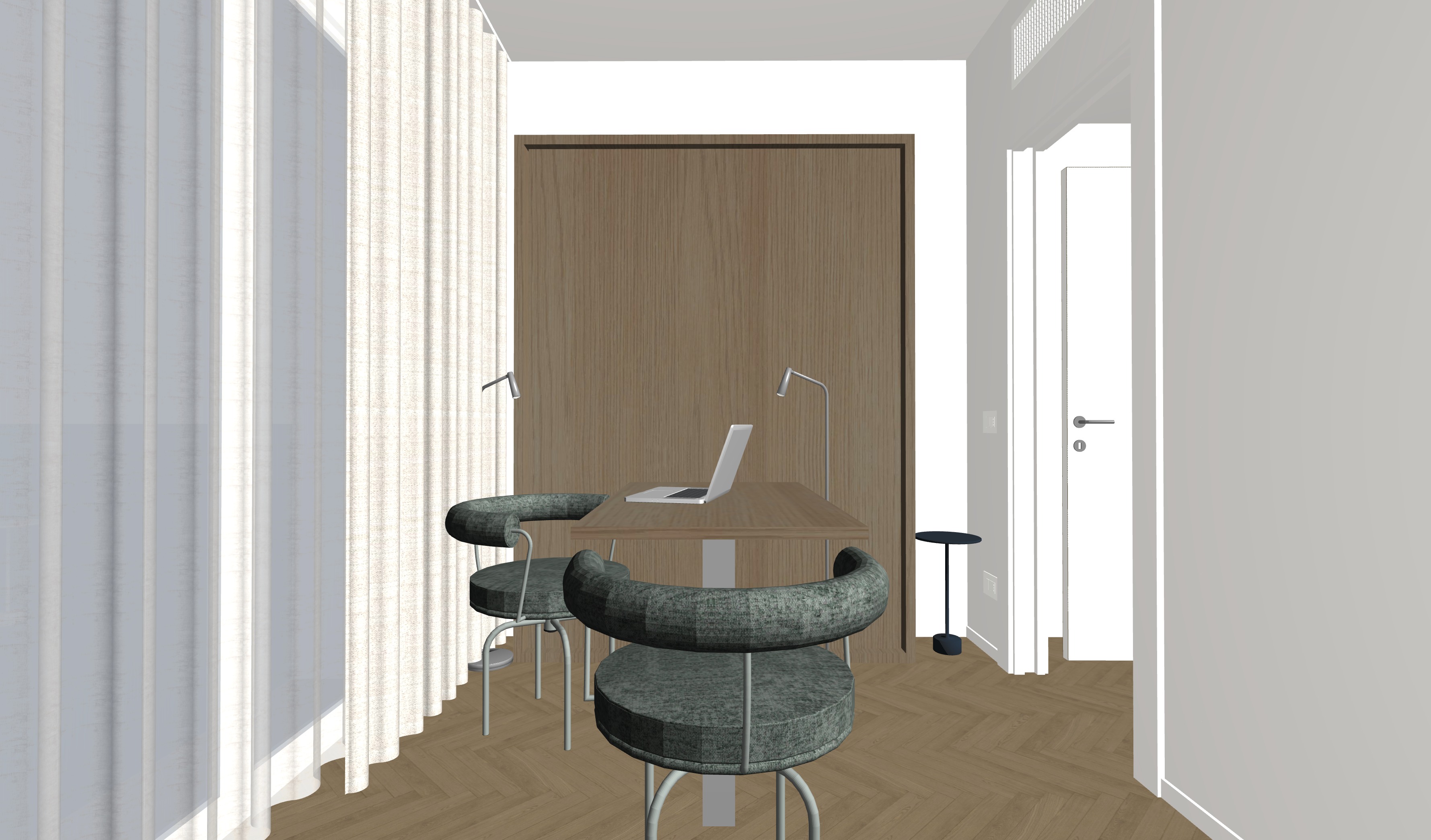 studio con armadio in legno rovere naturale scrivania in rovere e gamba cromata sedie di colore verde salvia scuro tavolino a destra di colore blu scuro le pareti sono bianche di fianco alla scrivania ci sono due lampade da terra cromate accese fai entrare un p di luce naturale dalla finestra e metti uno sfondo di chiome di alberi e case visti dall alto metti qualche oggetto di camera studio