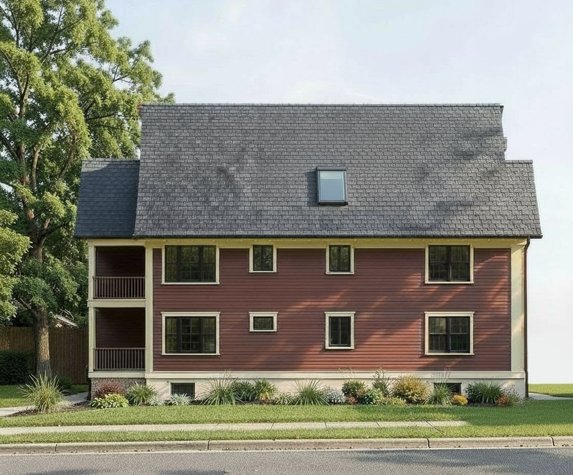 a dark grey shingle roof reddish brown siding cream colored trim with black framed windows grass landscaping with sidewalk and street int eh foreground and right side
