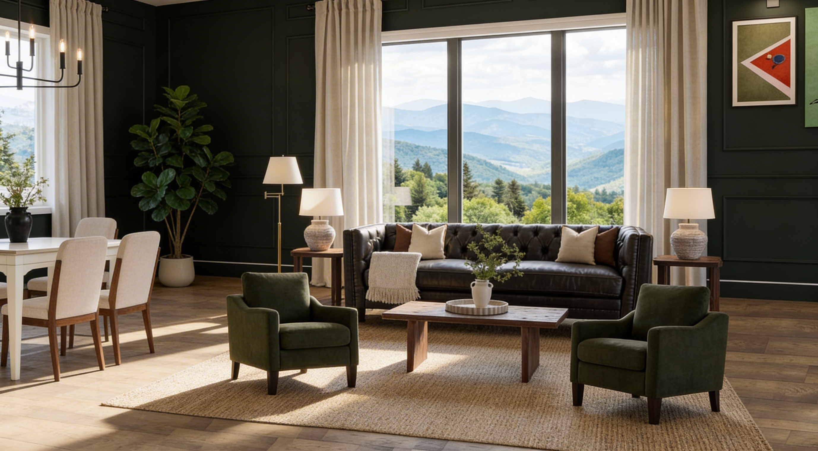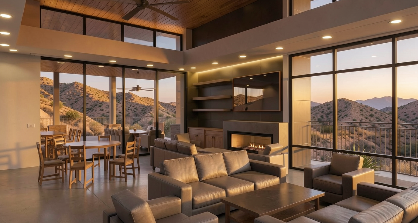 make exterior background desert hillside render for early evening include accent lighting ceiling to be medium brown wood plank make flooring a light wood plank add area rugs under furniture add greenery on plant shelf