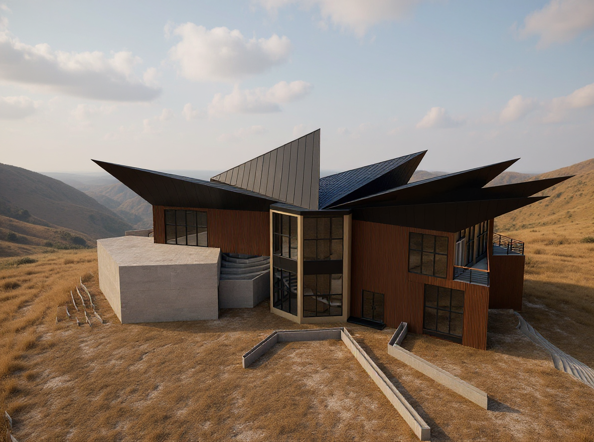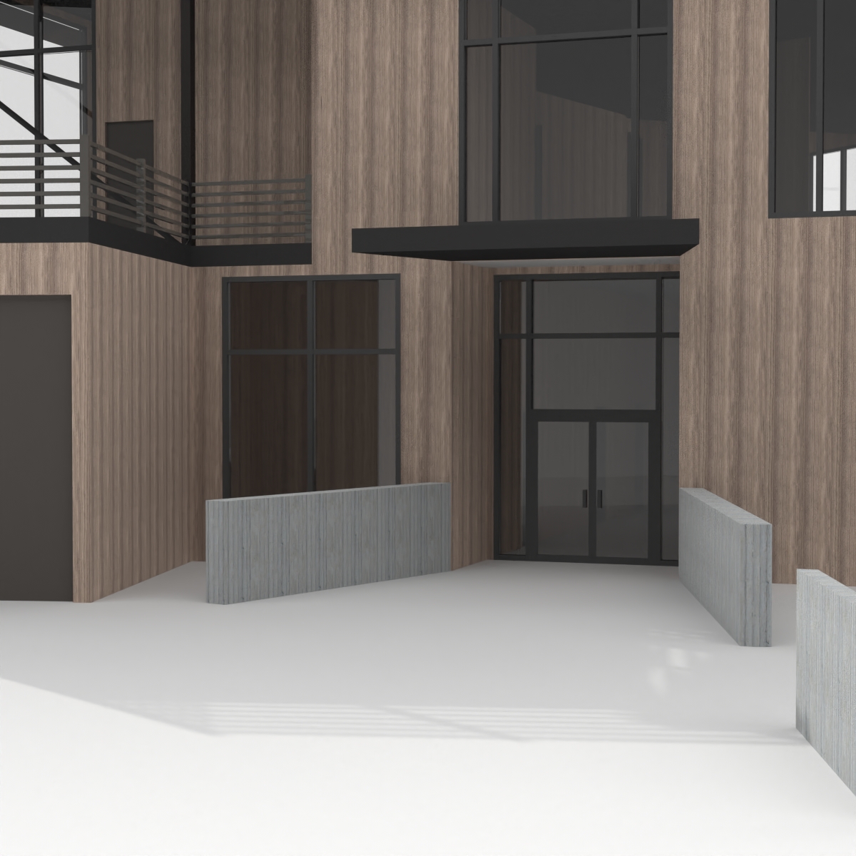 render this building entrance way with soft textures the walls are light grayish wood like a cabin add a nice paved landscape leading up to the door place small dainty trees in front of the left window