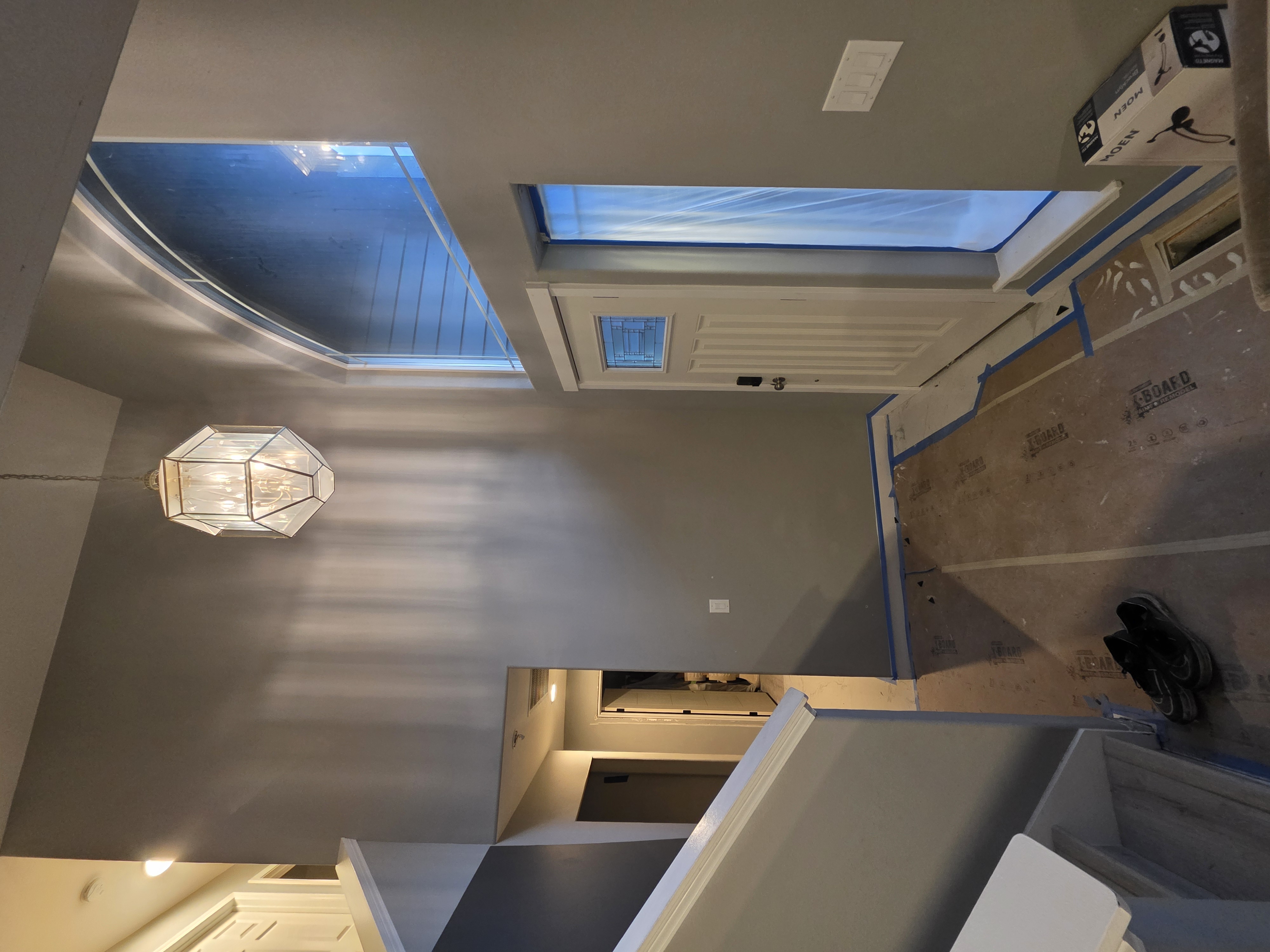 prompt for ai image generator a beautifully lit modern hallway with a high ceiling the walls are painted in a soft gray tone creating a calming atmosphere an elegant faceted glass chandelier with a warm golden light is hanging from the ceiling casting a gentle glow a large arched window filters soft natural light illuminating the area the staircase on the left features white railings that contrast elegantly with the gray walls the entry door is a classic paneled design in a crisp white color complementing the neutral tones of the space the flooring is covered with protective sheets suggesting an ongoing renovation with a pair of casual black slippers placed casually nearby the overall atmosphere is warm inviting and subtly sophisticated