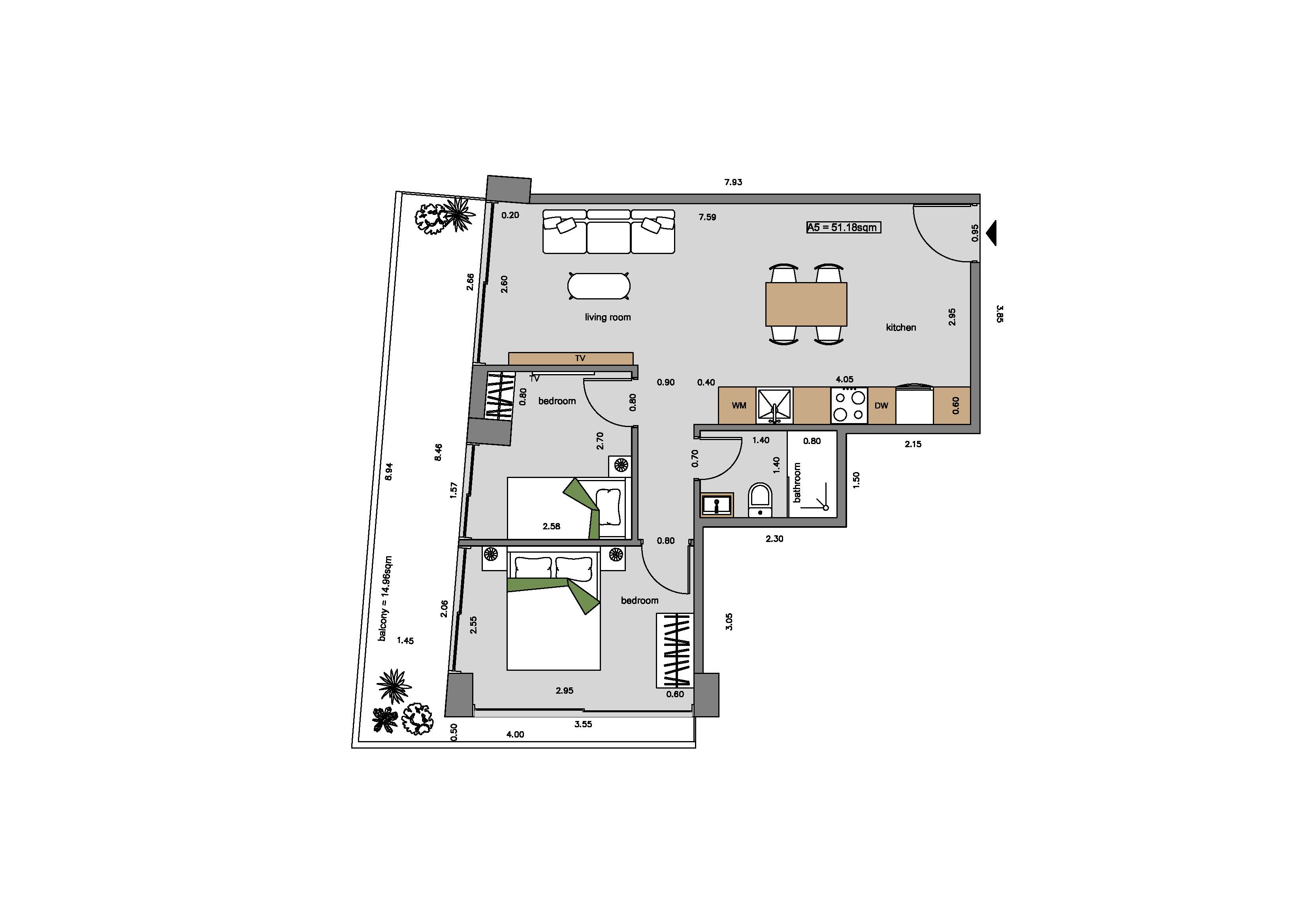 convert this floor plan into a realistic isometric 3d view of a full house show the space from an elevated angle with furniture walls and details visible floor tiles are grey colors are mostly white and a little wood color and some black balconies have red flowers and green plants use the same furniture as shows on the plan do not change the orientation of the floorplan