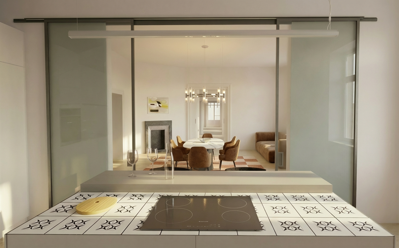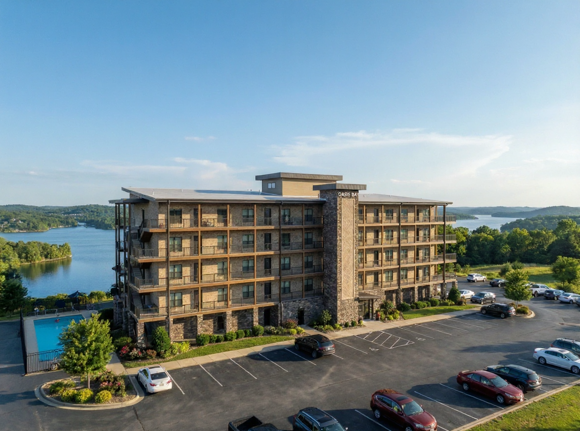 extend the rectangular swimming pool significantly longer toward the left side of the image maintaining the same width blue water color tile edges and surrounding concrete deck keep exact perspective shadows and reflections consistent with the rest of the photo do not change the building parking lot trees or lake do not extend the pool towards the viewer downwards