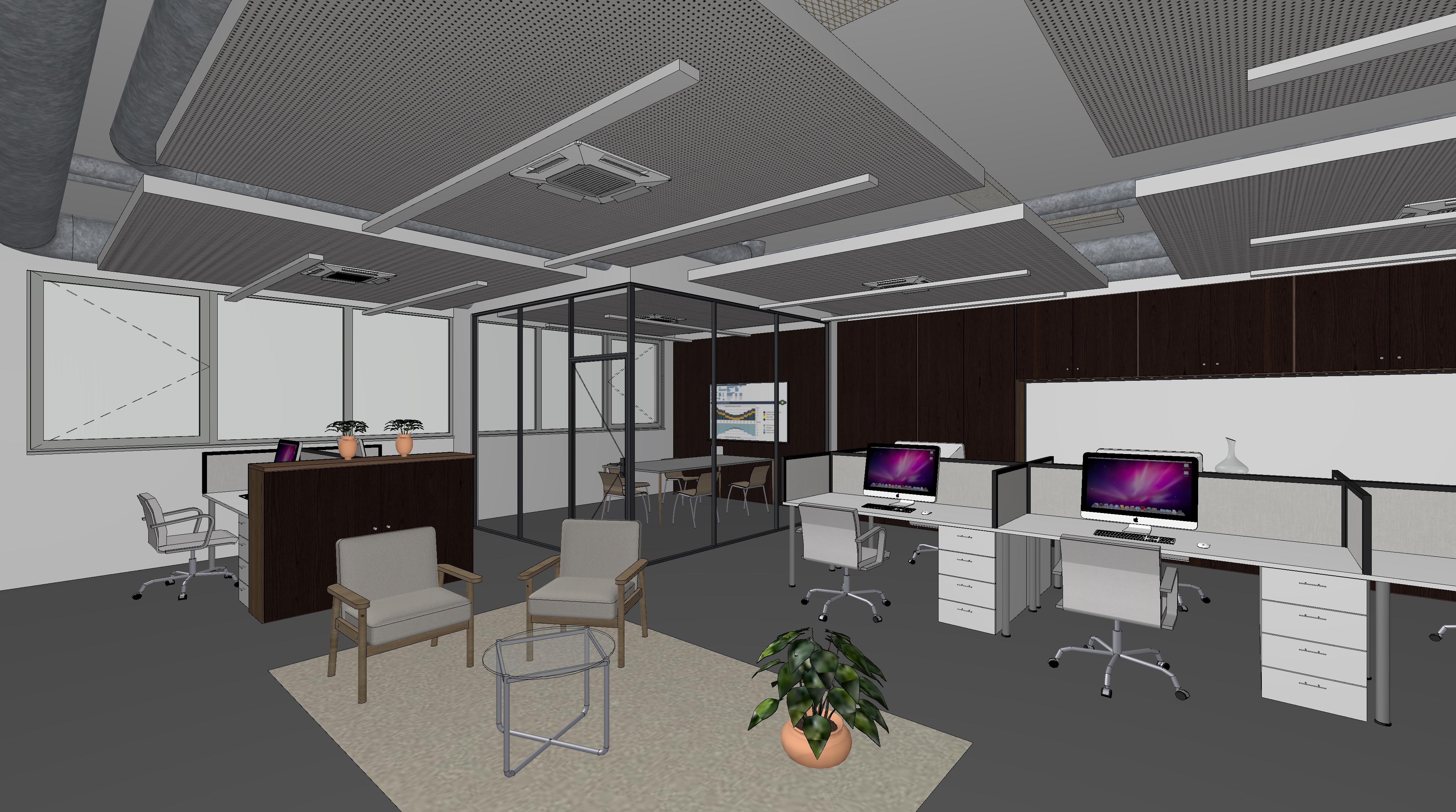 professional photorealistic office interior rendering modern open space workplace with dark walnut wood furniture and light wood accents perforated white plasterboard suspended ceiling suspended linear led lights with visible hanging cables exposed hvac ducts industrial style glass walled meeting rooms imac workstations cozy waiting area with beige armchairs potted plants in terracota pots dark gray matte epoxy resin flooring bright and clear atmosphere high key lighting abundant natural daylight from large windows architectural visualization high end corporate office design ultra detailed 8k resolution photorealistic materials realistic shadows and reflections professional interior photography style depth of field ambient occlusion global illumination