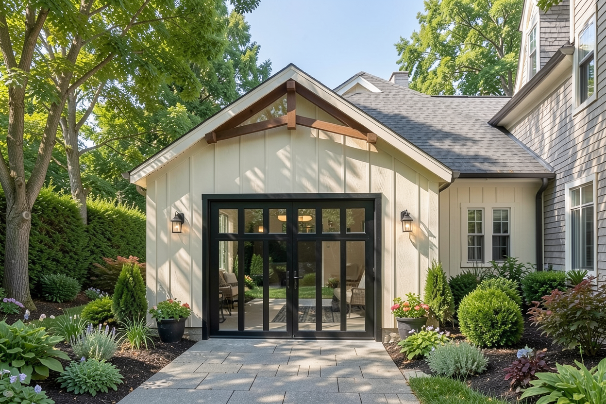 add landscaping and make photorealistic all glass door with black frame patio outside of door dark grey siding