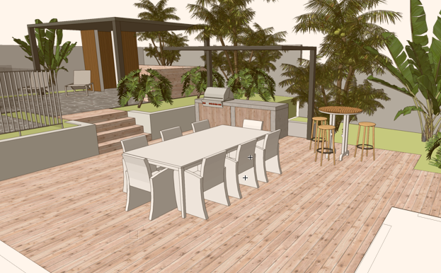 adding more tropical planting a man using the bbq on the left of bench and a family siting at the table change table