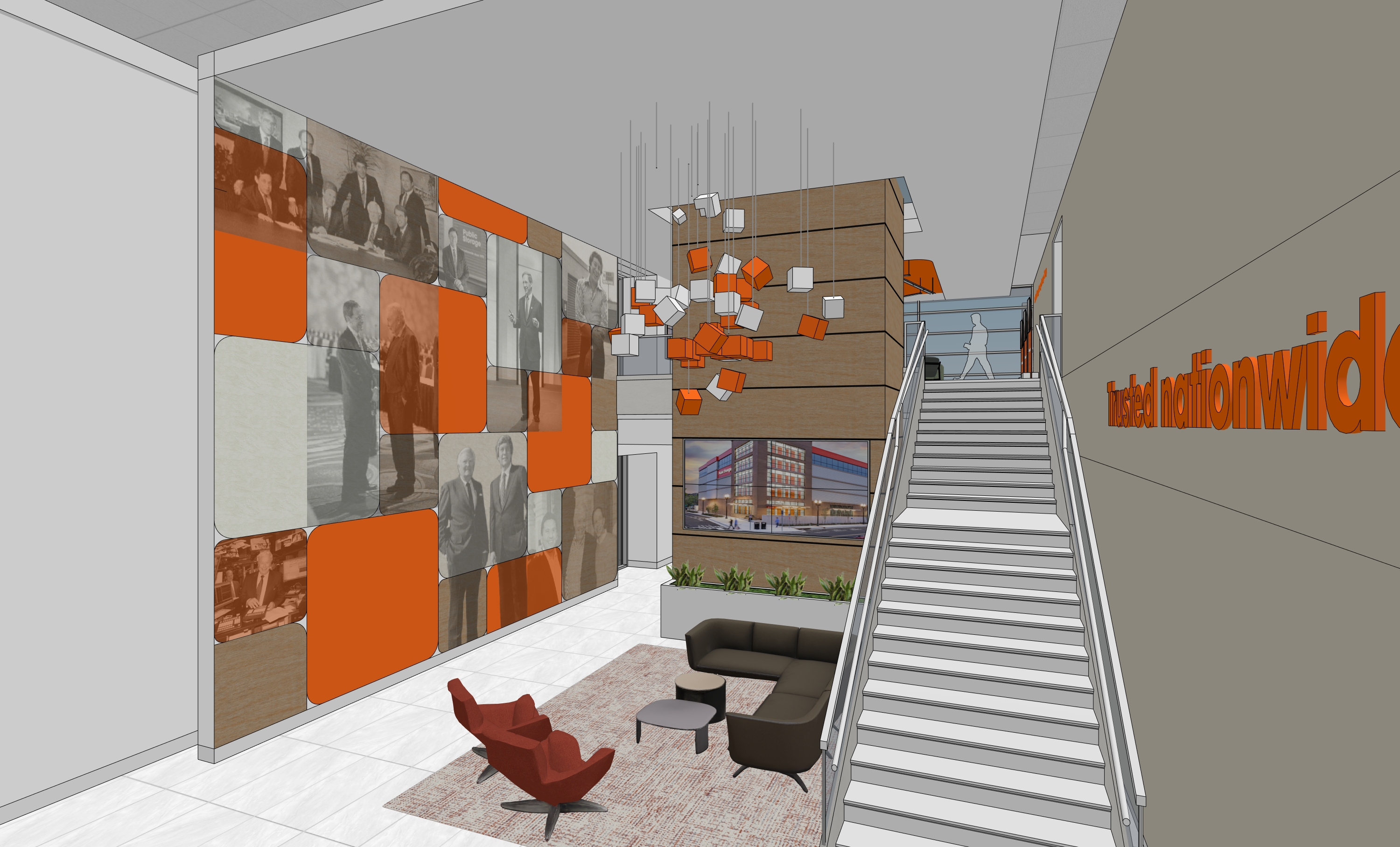 photorealistic interior polished tile floors white walls and light metal orange accents left wall painted soft light beige color that wraps up onto the ceiling as accent text on white wall on the right is orange acrylic letters boxes floating in the ceiling in the middle are soft dim warm white light soft glowing there s wood accents on the middle tower the space is lit up with soft ceiling soft lights bright lighting and overall environment is soft bright lighting edge of orange color on left wall and ceiling is glowing soft warm white light