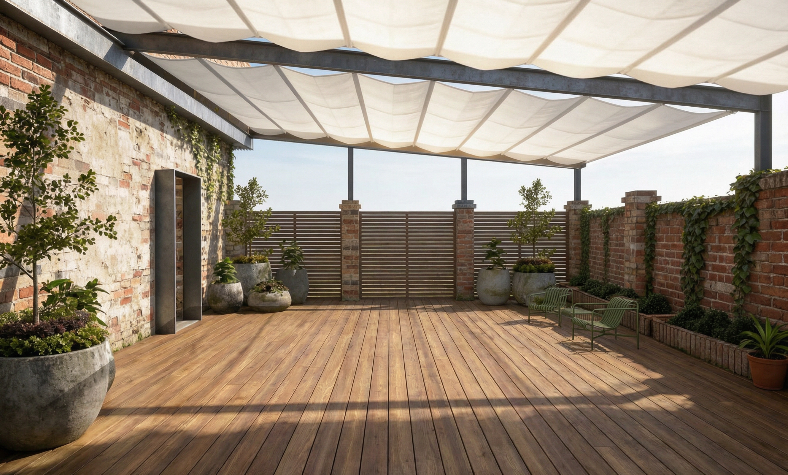 realistic render tall grass foreground stone paths large glass windows fog trees in background with a small creek running through