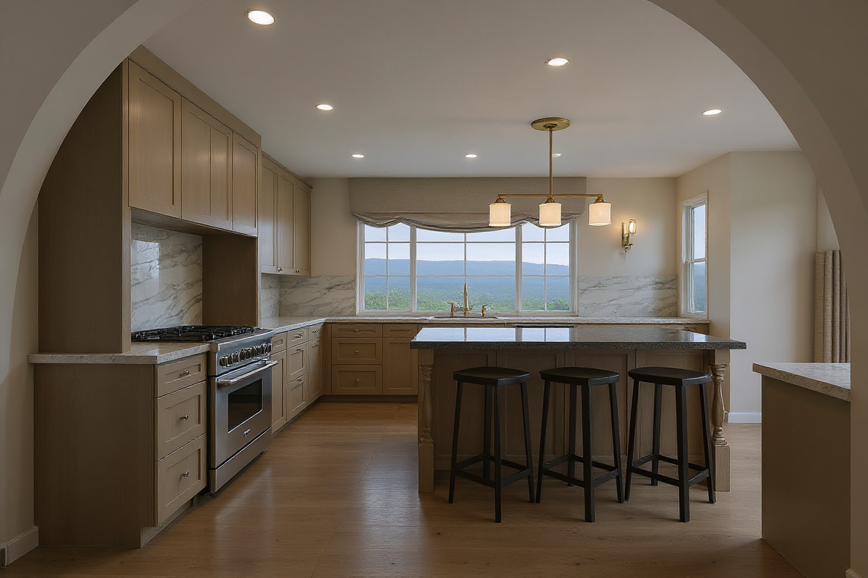 generate a high quality photorealistic render of the provided architectural elevation drawing preserve exact geometry proportions window spacing and material layout render at 4k resolution with ultra realistic daylight lighting clear sky soft shadows ambient reflections ensure all exterior materials colors and textures match the client s specifications exactly match the window grid style do not add any brick to the fa ade do not add extra dormers or light fixtures to the image use only the materials specified in the elevation drawing and color list make sure to match the rooflines and gables exactly as drawn match each component as follows body color greek villa sw7551 trim color greek villa sw7551 porch columns stained heartwood windows black front door ripe olive sw6209 roof color driftwood garage door black gutters black photometric lighting should highlight color accuracy and realistic reflectivity use global illumination and hdri sunlight calibrated for afternoon warm tone maintain true color fidelity consistent exposure and physically accurate shadows add context elements landscaping realistic lawn shrubs and shadow cast trees suited to suburban setting create concrete driveway walkway from front porch to sidewalk background complementary skies matching exposure no distortion or overenhancement output a single landscape oriented photorealistic rendering that is architecturally faithful visually balanced and color accurate to the above specifications
