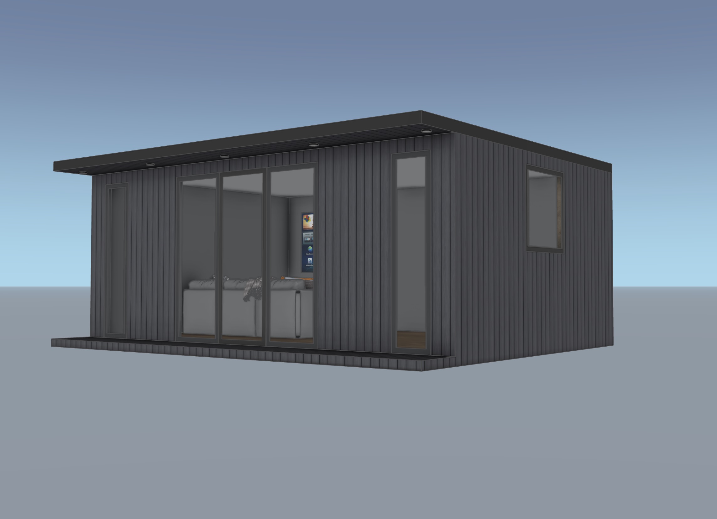 modern minimalist house sleek charred cladding exterior large glass windows cozy sofa inside serene atmosphere soft natural lighting clear blue sky modern garden setting