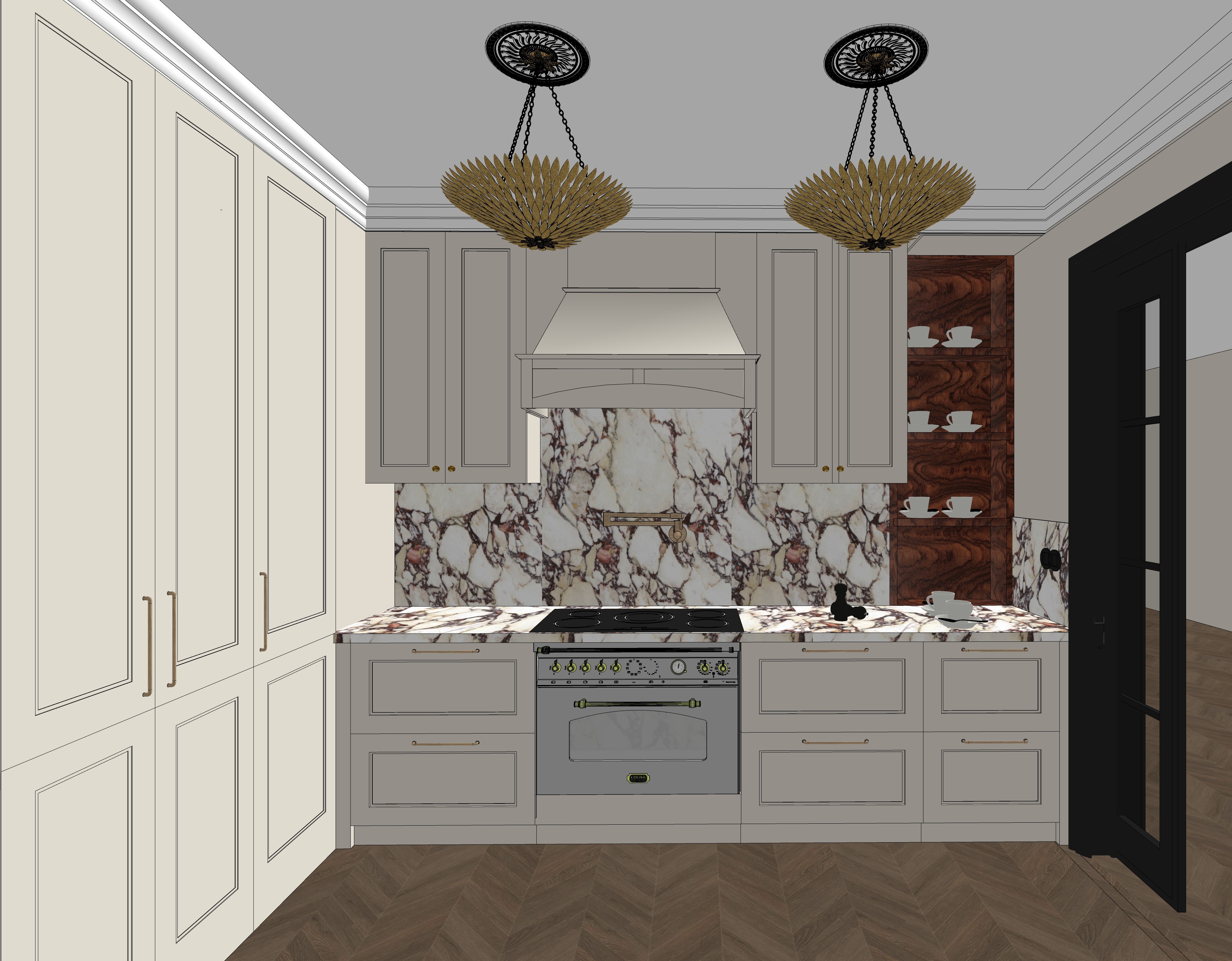 fronty mebli kolor kaszmir bia y sufit dodaj o wietlenie led na sificie i pod p kami zmie lampy wisz ce na szklane drzwi czarne pod oga ch odny odcie drewna o wiat o wpadajace do pomieszczenia r wnomierne dzienne