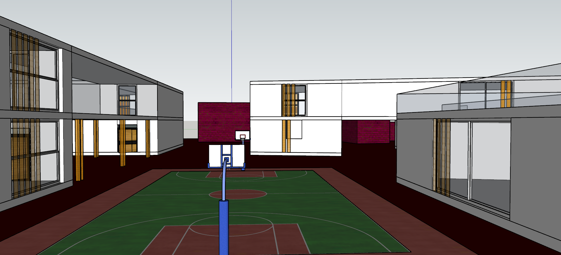 modern exterior shot render during sunset with a basketball court and grey beige concrete walls and grass architecture