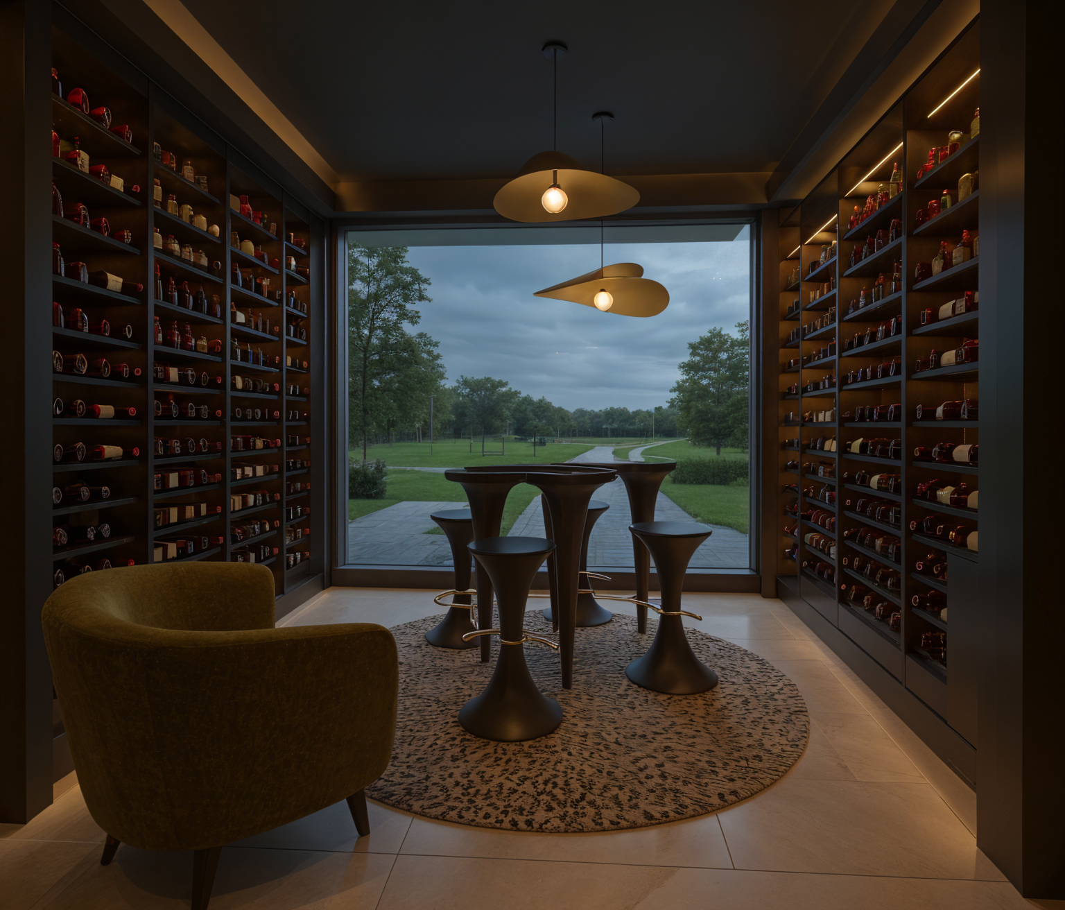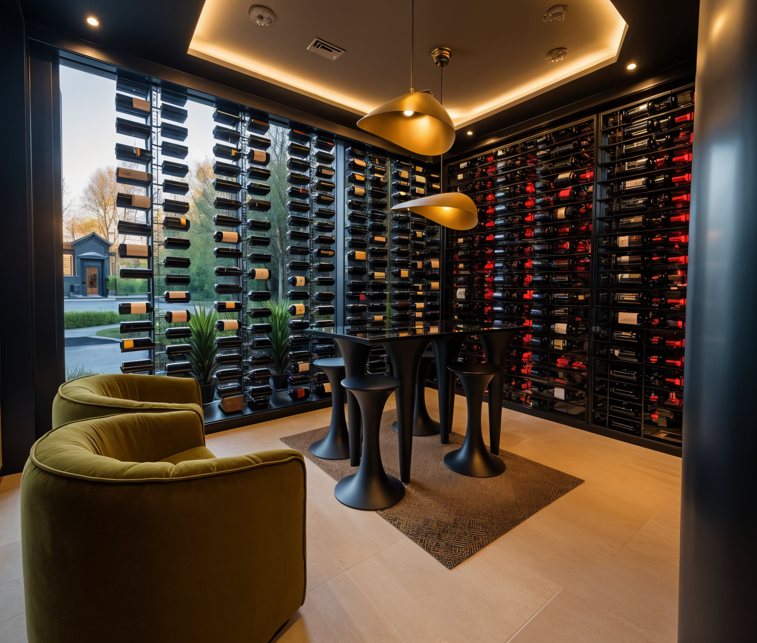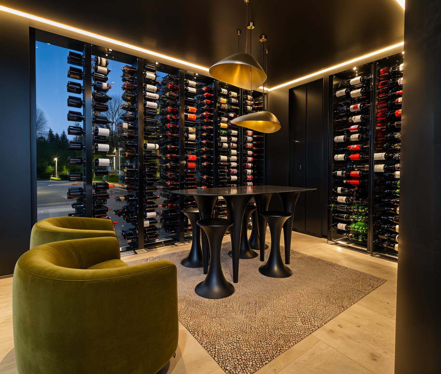 wine cellar interior with a modern luxurious ambiance the walls are lined with sleek dark black wine racks elegantly displaying an array of deep red and green wine bottles make the view from the window of a luxurious driveway the centerpiece features a chic matte black table with smooth curving black chairs a plush olive green armchair adds a touch of comfort the room is softly lit by stylish modern pendant lamps in matte gold and black with led lighting surrounding the ceiling and bar area the floor has a subtle beige and cream tile with a subtle textured leopard rug under the table and stools architecture