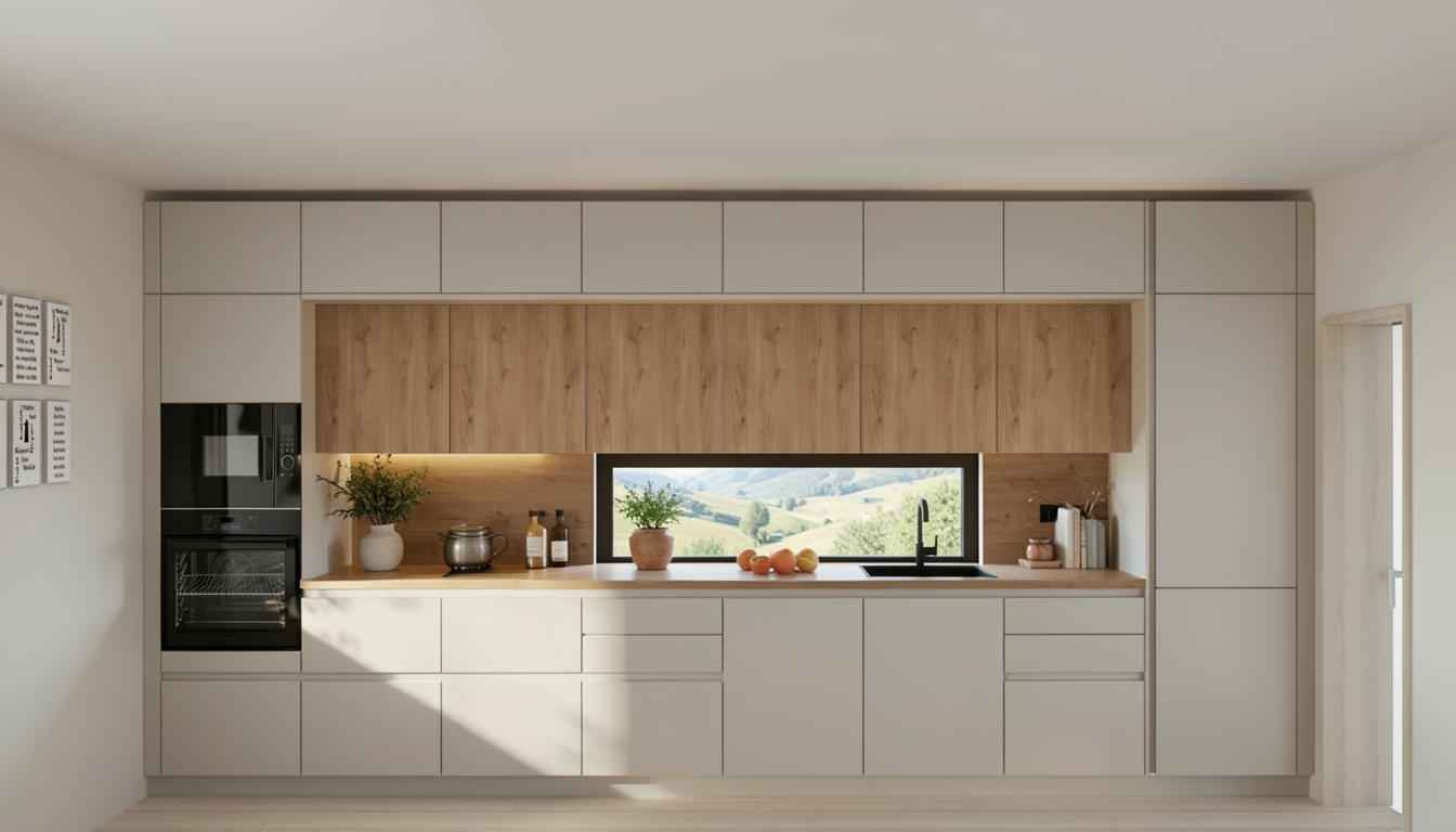 keep the colors keep the dimensions of the cabinets add decorations the landscape outside window