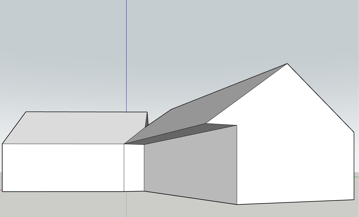 modern pitched roof building with full wall of glazing black corrugated roof cladding in a heavily planted setting mature trees are behind the building soft light