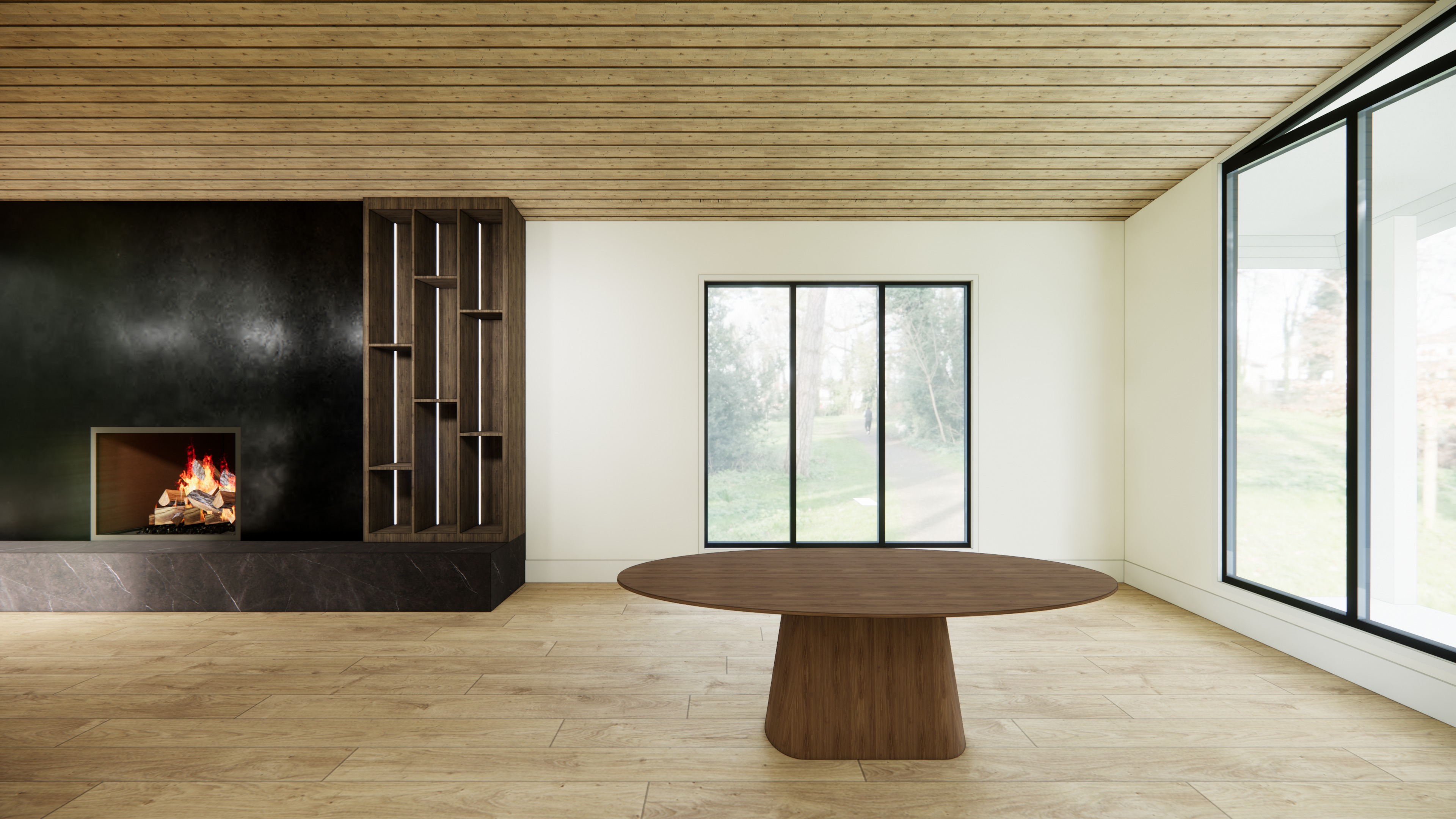 please add 6 dining room chairs around the table and a chandelier hanging from the ceiling the chandelier should look like tree branches with lights coming from the end of the branches