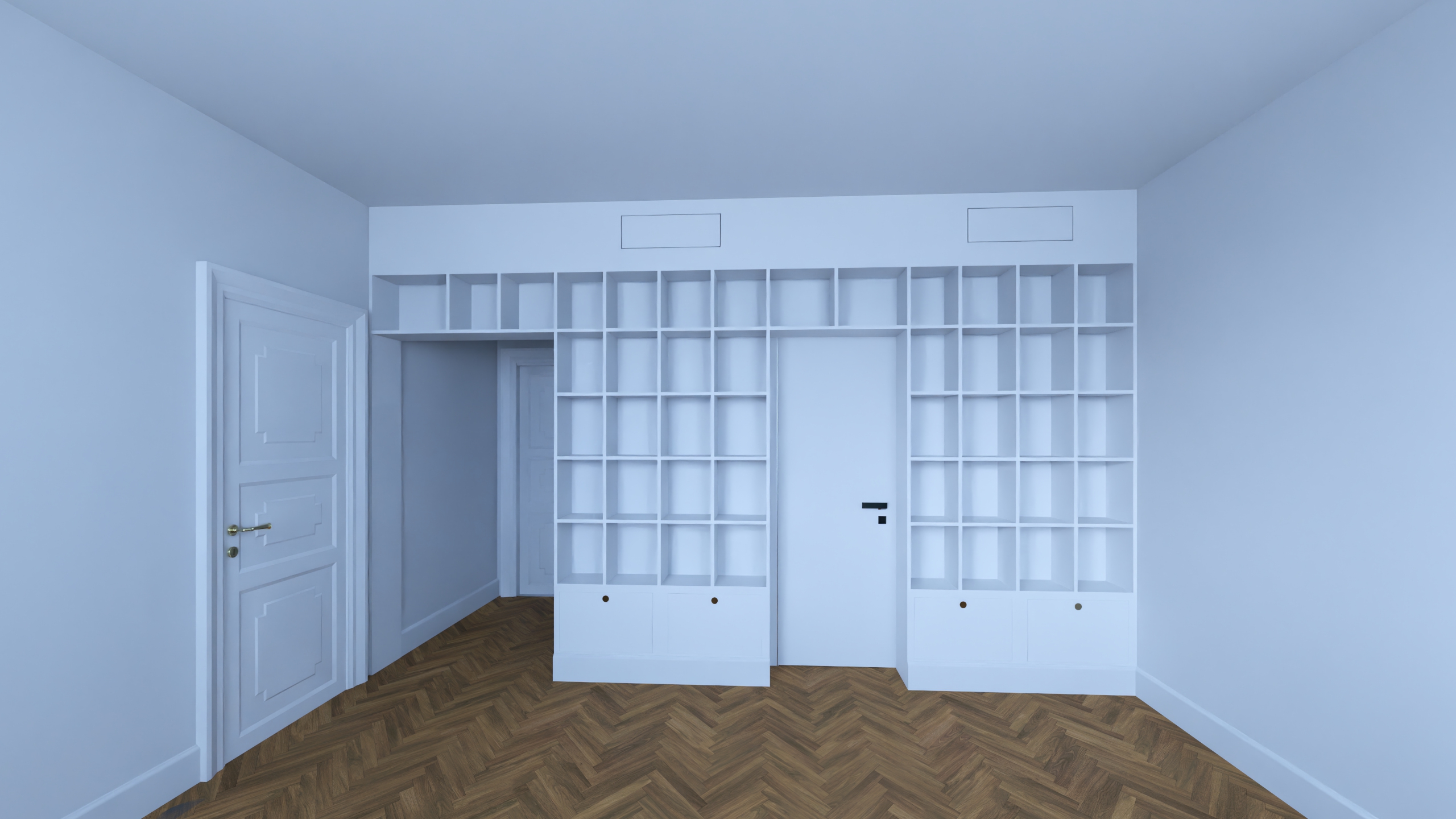 a wide angle photorealistic interior photograph of an empty newly built modern apartment room as depicted in image 5 png the perspective is maintained looking into the room the left side features a detailed white paneled door with brass hardware a detailed inner doorway and a matching panel door beyond it the central wall is dominated by the large precise white open grid shelving unit seen in image 5 png with its exact configuration and bottom drawers placed within three of the shelves are the small decorative woven wicker baskets from image 5 png the main central flush door and the two rectangular ceiling vents are in place all original architecture and placement are preserved the new element is the floor the entire floor surface is a flawless highly polished rich walnut italian herringbone parquet laid with exquisite detail precisely defining the perimeter of the room following the base of the doors shelves and walls is a continuous intricate geometric fascia and bindello inlay border in matching walnut and light wood exactly as seen in the foreground of image 5 png the border traces the entire room outline the walls and ceiling are a textured off white limewash and the room is brightly and warmly lit by natural daylight casting soft shadows the scene is immaculate and pristine