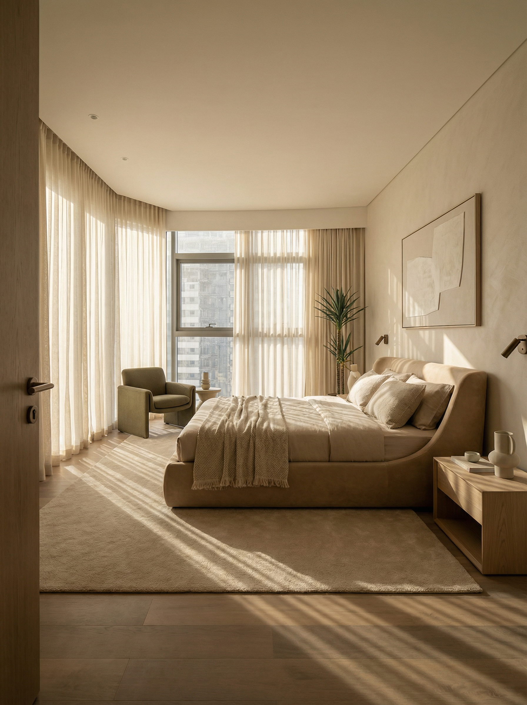 render this kitchen with stone grey color cabinets and black bar pull handles and faucet with quartz countertop and backsplash with a very light grey vein and appliances should be stainless steel flooring to be light oak walls to be painted flat white and base molding glossy white