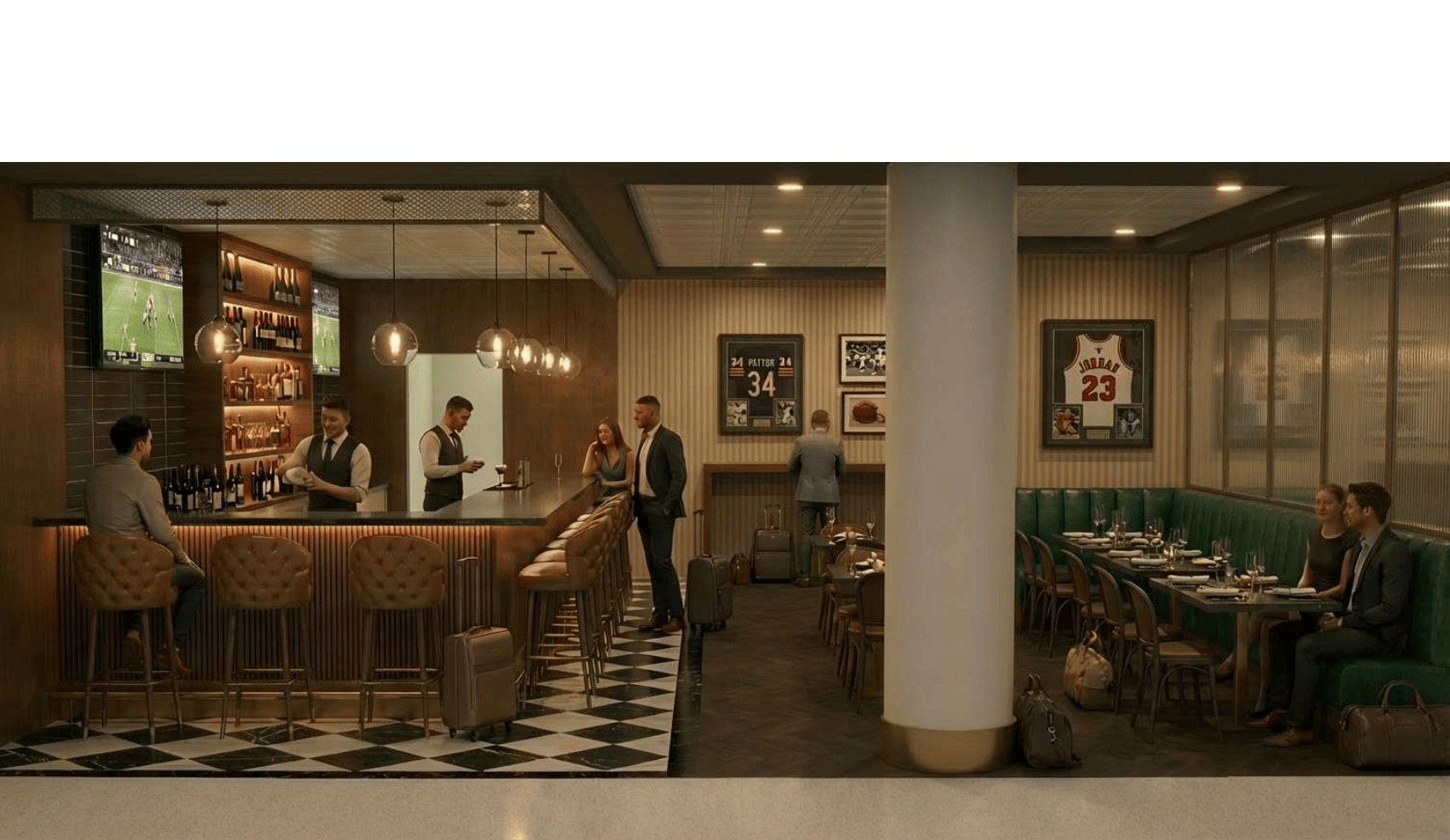 add a small section of bulkhead above this image which is currently shown as a white section that signage can be placed on we would like to use a diamond pattern made of metal panels with a combination of solid and perforated diamonds within the pattern the metal color should be a dark bronze to tie into the materials that we are currently using in the space keep everything else within the attached image the same only apply this bulkhead to the white portion shown in the image no where else
