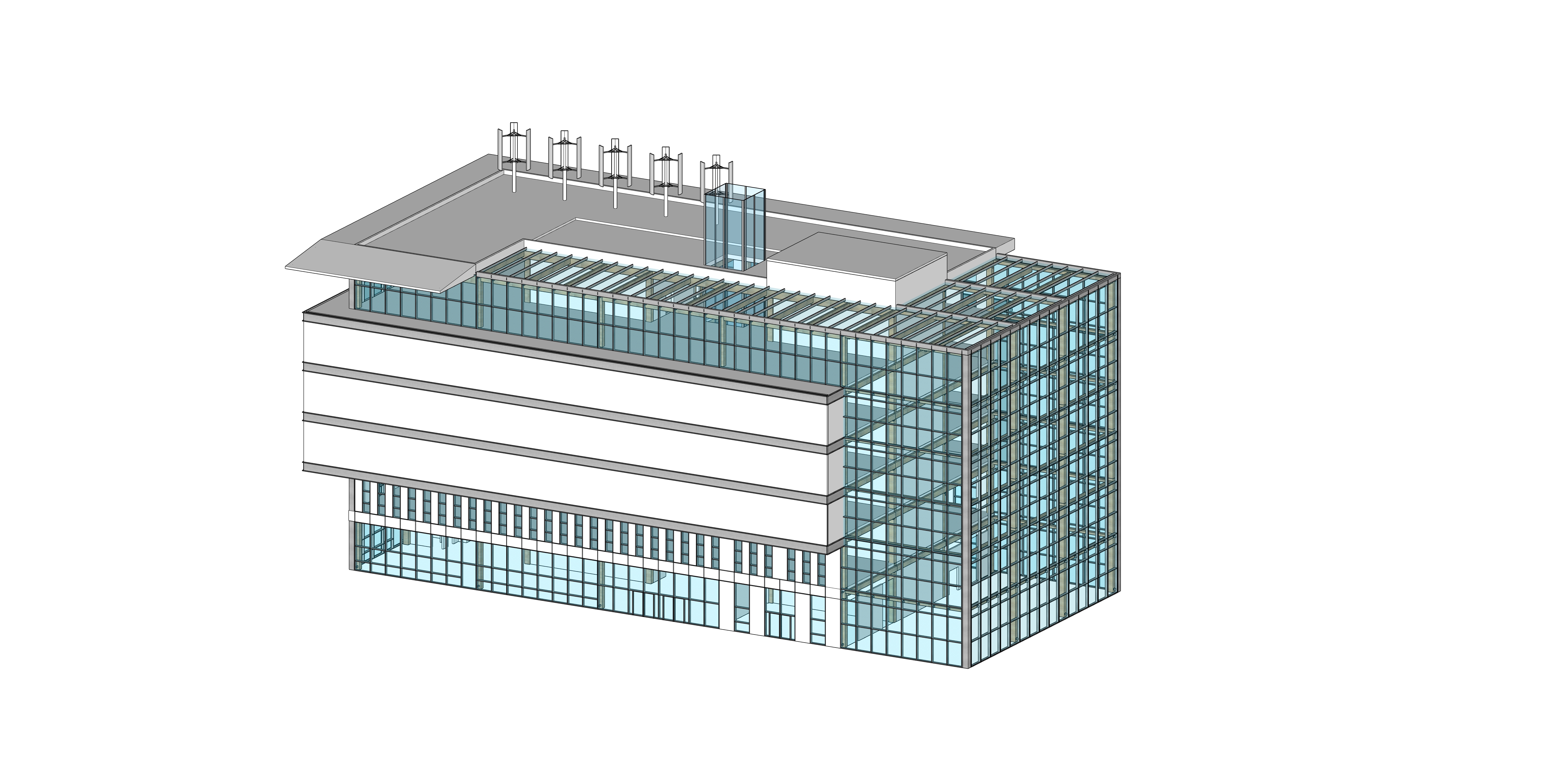 exterior shot i need to render the building the building is designed for vertical farming and develops over six above ground floors the project is characterized by the presence of two main envelope systems a glazed greenhouse located in the last bay on the right side of the fa ade and a projecting opaque horizontal band occupying the central floors of the building the greenhouse conceived as a buffer space extends through the entire height of the building within the last structural bay and continues onto the roof in the front portion where the roof is absent this space has a full internal height without intermediate slabs forming a large continuous volume inside the greenhouse lightweight steel structures similar to scaffolding are anchored to the timber load bearing structure creating an articulated system of projections and recesses designed to accommodate the cultivation systems the greenhouse covers a plan area of 12 26 m the crops cultivated in the building both in the internal growth chambers and within the greenhouse space are dedicated to pharmacological research the species grown include rosmarinus officinalis calendula officinalis thymus vulgaris aronia melanocarpa plantago major hypericum perforatum salvia officinalis and echinacea the cultivation techniques adopted include dwc deep water culture ebb flow nft nutrient film technique and fogponic systems the load bearing structure of the building is made of engineered timber with beams and columns in pres lam post tensioned lvl this structural system is not directly exposed to the exterior but is fully enclosed within the building envelope in the portion occupied by the greenhouse the timber structure is enclosed by a continuous self supporting glass fa ade consisting of a steel frame anchored to the primary timber structure the fa ade is composed of solar control selective glazing with an additional external glass layer consisting of lsc panels luminescent solar concentrators similar to the system used in the palais des congr s in montr al these panels are mainly red and blue while yellow and green tones are used less frequently because they are less favorable for plant growth processes the greenhouse roof is partly composed of glazed surfaces integrated with photovoltaic cells and partly of operable louvers that allow natural ventilation and the release of warm air the language of the glass fa ade continues laterally along the rest of the building particularly at the ground floor second floor and top floor in these portions however some glazed modules are replaced by opaque panels visible as white parts in the model in these areas the glass remains transparent and does not include lsc panels which are limited exclusively to the greenhouse the second third and fourth floors are instead characterized by a continuous opaque horizontal band projecting 3 meters beyond the building perimeter this band is horizontally divided into three layers articulated by c shaped aluminum profiles designed to create visual continuity between the opaque fa ade band and the frame of the glazed envelope in the first view long side the cladding of this portion of the envelope consists of building integrated photovoltaic panels bipv similar to those used in the red river college innovation center characterized by a sand colored finish on the short side of the building this opaque portion features a green wall cladding while on the opposite side from the bipv fa ade the cladding is composed of trespa panels the roof of the building has a mixed configuration the portion above the greenhouse is glazed consistent with the envelope system below while the opposite part on the left side of the building is opaque on the main fa ade this part ends with a cantilevered element of about 5 meters conceived as a thin architectural sheet that covers and protects the projecting steel beam the roof also hosts five micro wind turbines integrated into the building s energy system the vertical volume emerging from the roof is a glazed light cone designed to bring natural daylight into the interior spaces the opaque portions at the ground floor and second floor are clad with white trespa panels white fa ade cladding