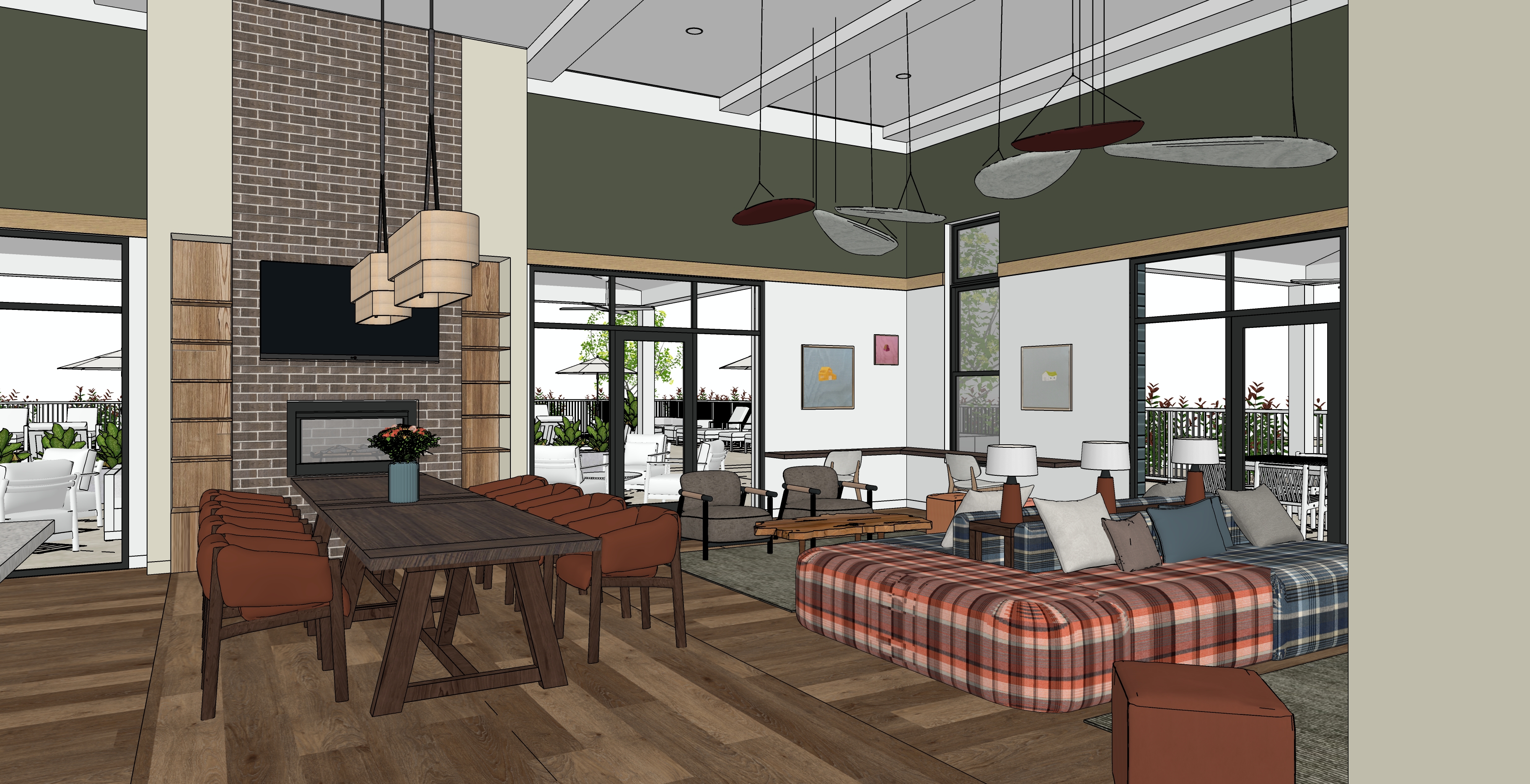 the community room is warm and welcoming light add tasteful curated decor to shelves on either side of the fireplace the tv should be playing a golf tournament on it the fireplace should be softly lit with a small fire the overall space should be bright and welcoming but warm and soft outside is a sunny but slightly cloudy day