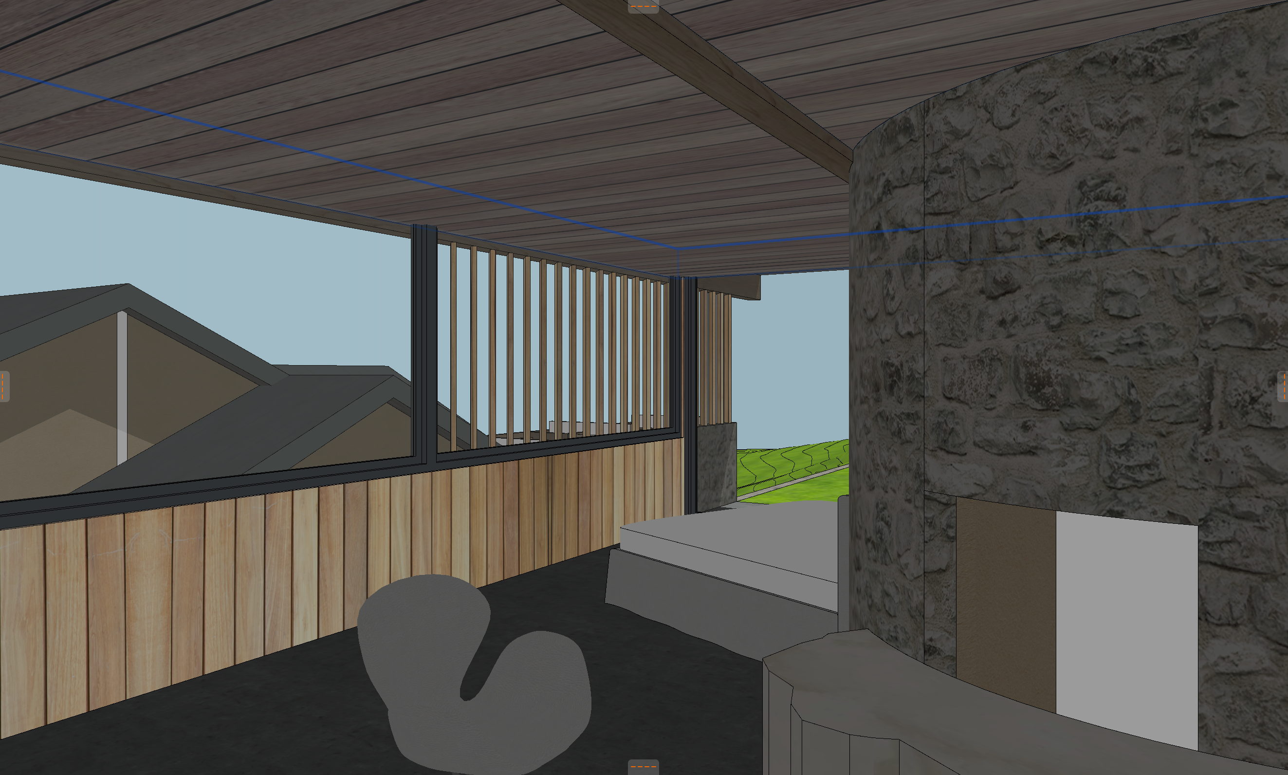 landscape hillside with sagebrush and tall wild grasses brown drystack stone walls corten standing seam metal roof interior walls to be vertical light wood fire in fireplace with person sitting on a rough cut stone hearth white fabric bed