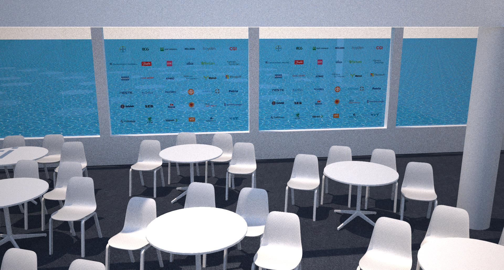 while maintaining maintain the colors there are taped logos on the window behind the window is sea sun is shining from the sea