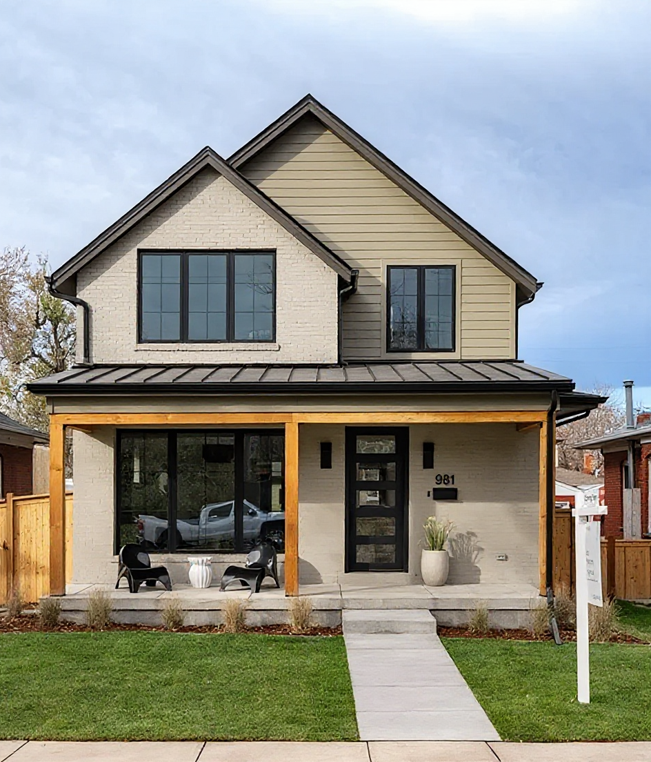 create a beautiful architecture magazine worthy image of this building keep colors textures and existing elements show cars people eating outside and a lively ambiance dramatic vibe