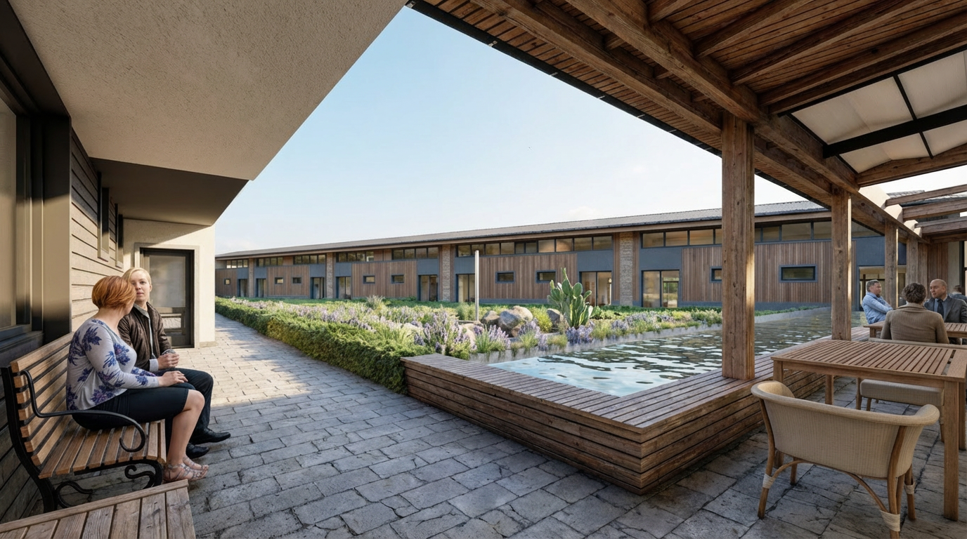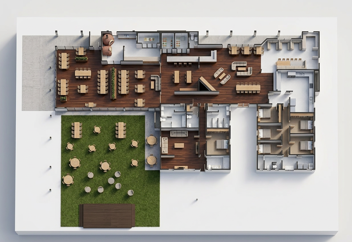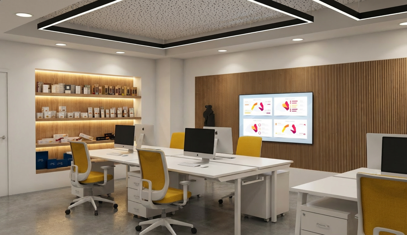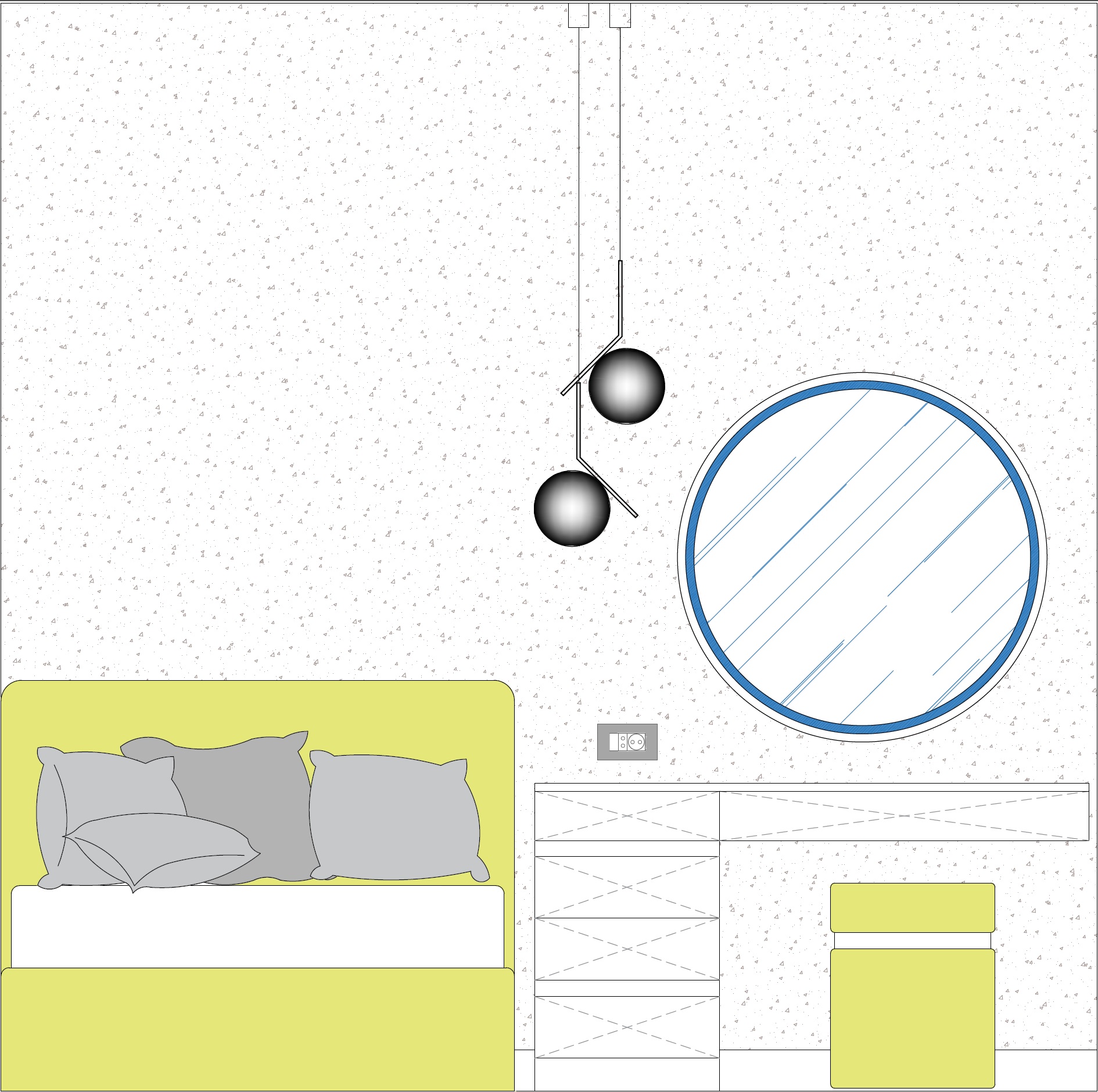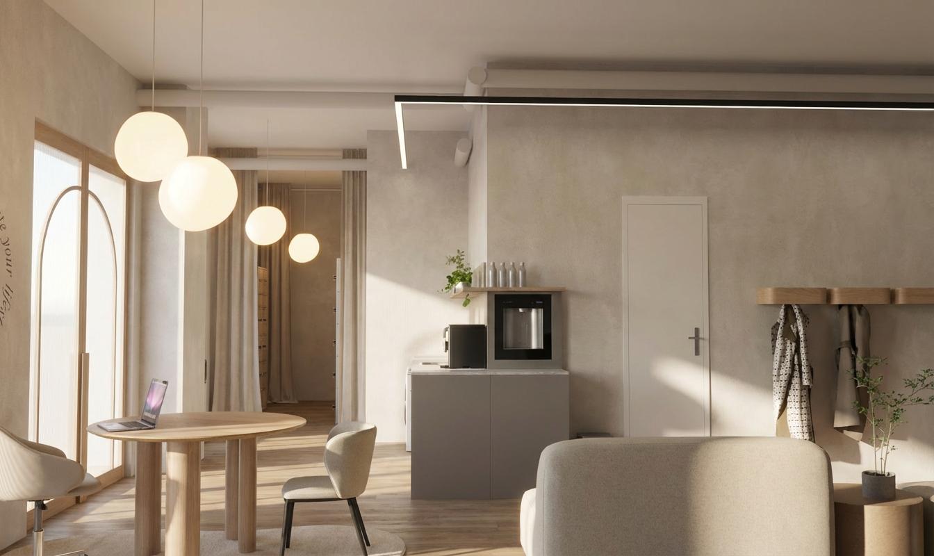 interior design visualization realistic high resolution 3d render wall dimensions 267cm length and 265cm height in a soft beige finish a 120cm wide bed with a 100cm high headboard upholstered in beige fabric vanity desk in sand beige mfc finish featuring drawers with integrated beige gola profiles for a handleless look makeup mirror with integrated led strip lighting two flos ic s1 pendant lights in gold finish realistic textures architectural lighting professional photography style