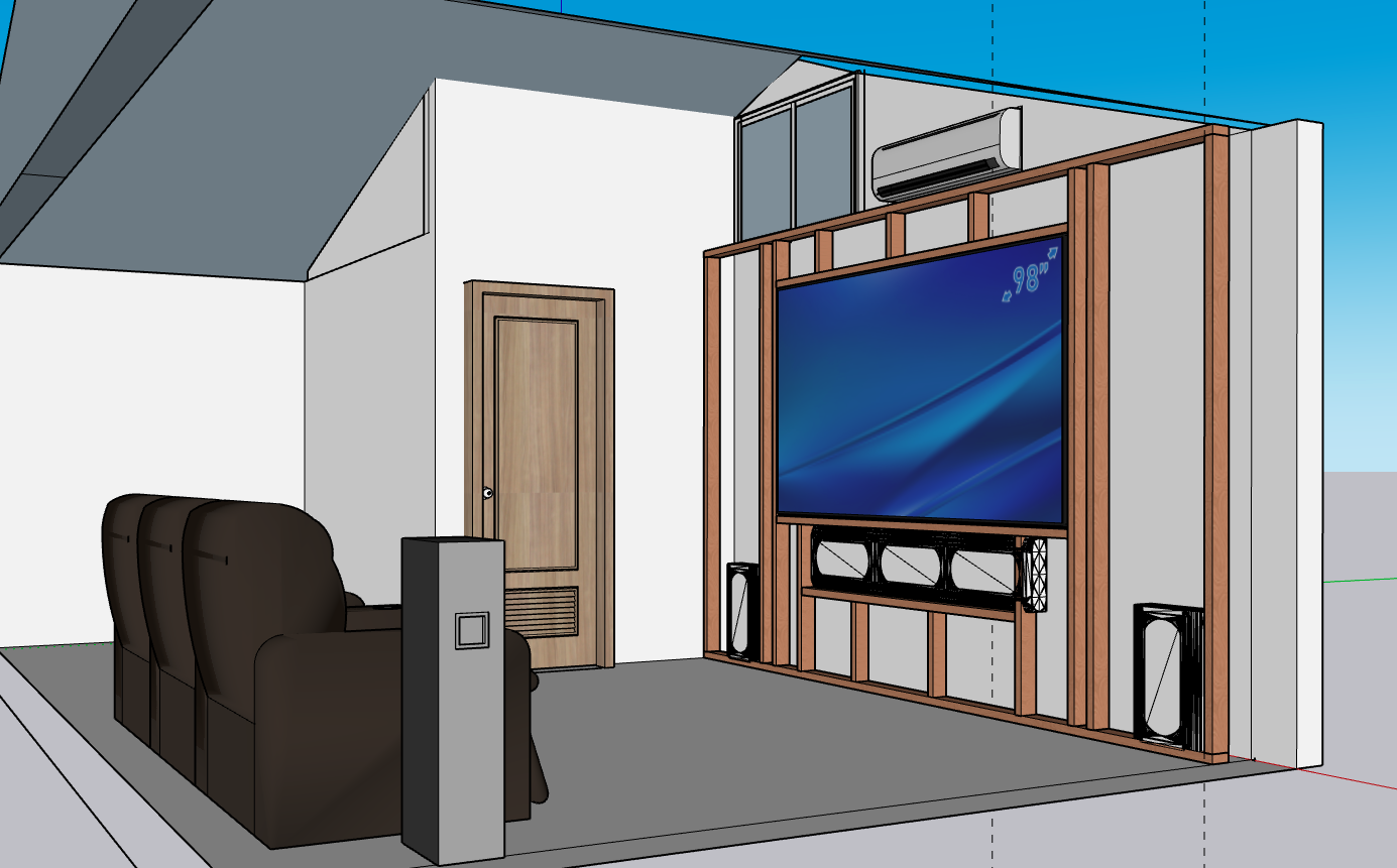 a modern home theater setup with a cozy and inviting atmosphere the main wall features a large flat screen television displaying a subtle blue wallpaper with soft gradient patterns the television is framed by sleek wooden panels in warm oak tones below the tv a contemporary sound system with black speakers rests on a minimalist cabinet on the left plush dark brown reclining chairs promise comfort and relaxation the walls are painted a crisp white enhancing the room s brightness a light wooden door complements the tv frame adding harmony to the design above the tv a sleek silver gray air conditioning unit is subtly integrated into the decor the ceiling and floor are in soft gray shades creating a balanced and serene environment use natural lighting to accentuate the textures and colors creating a relaxed and immersive viewing experience no people present focus on the interior design and elements