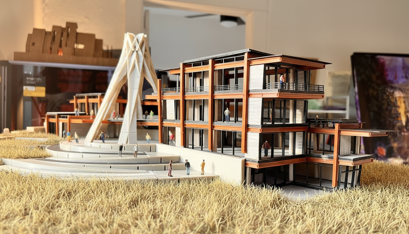 architecture rendering detailed and realistic add people make it populated perforated metal on the right stone cladding in the back