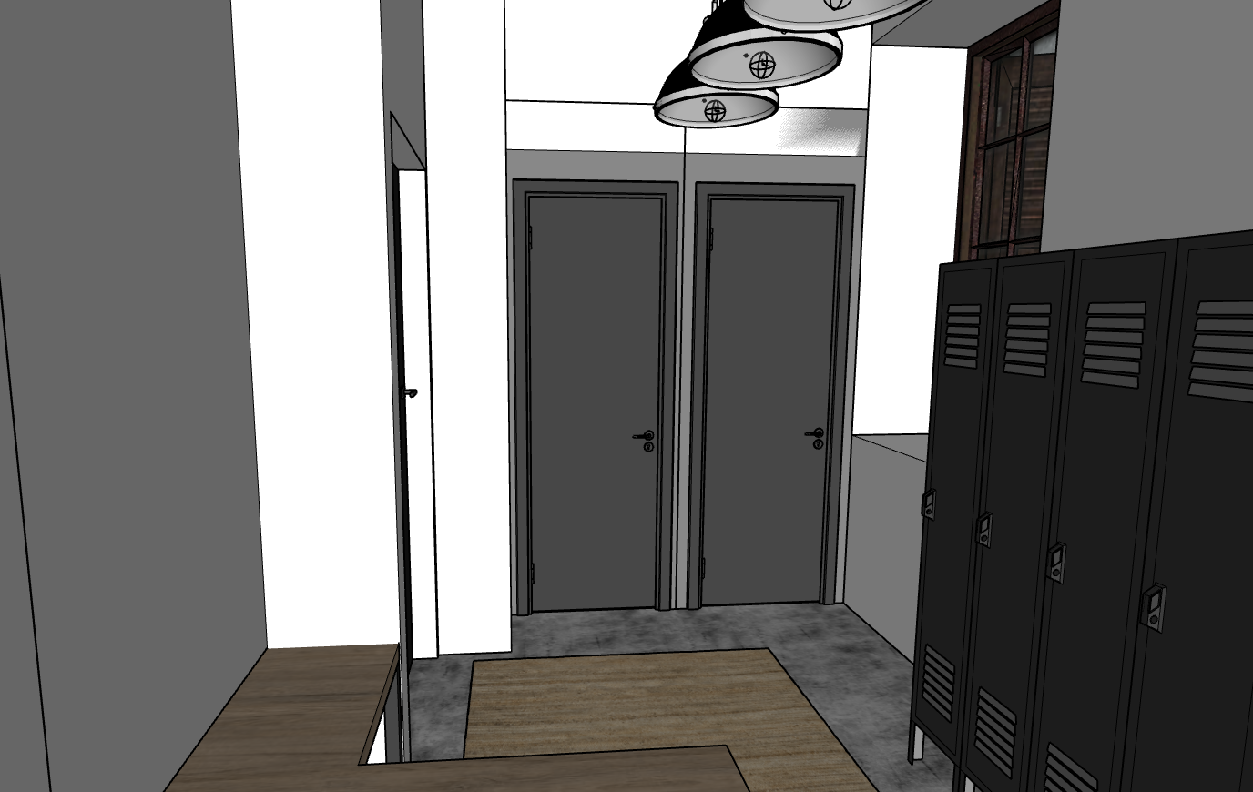 photorealistic render of a minimalist locker room with industrial pendant lights concrete and wood flooring matte black lockers and neutral walls keep the exact layout and materials use realistic daylight with soft shadows from tree foliage through the window add subtle ambient occlusion warm contrast and slight surface imperfections for realism please add a person this is a staff room in a lobby