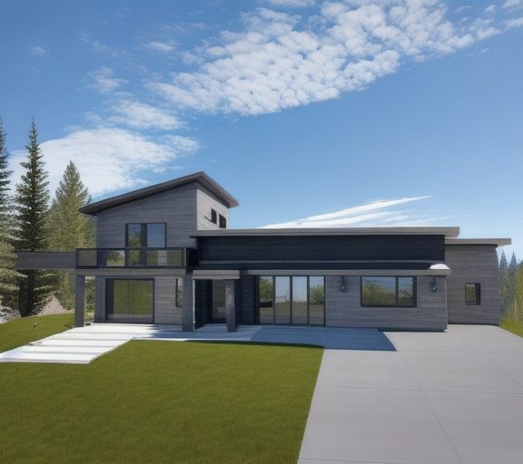 new urbanism exterior shot render a modern mountain house with a sleek design the walls should be a warm unfinished wood tone on the sides and a soft light grey stucco in the center with a black metal roof the windows are large and made of clear glass reflecting the greenery around there should be a wooden deck with a warm brown finish surround the house with vibrant green landscaping and a few delicate flowering shrubs in soft pink and white the atmosphere is serene and inviting with sunlight gently illuminating the facade surround the house with tall coniferous trees architecture