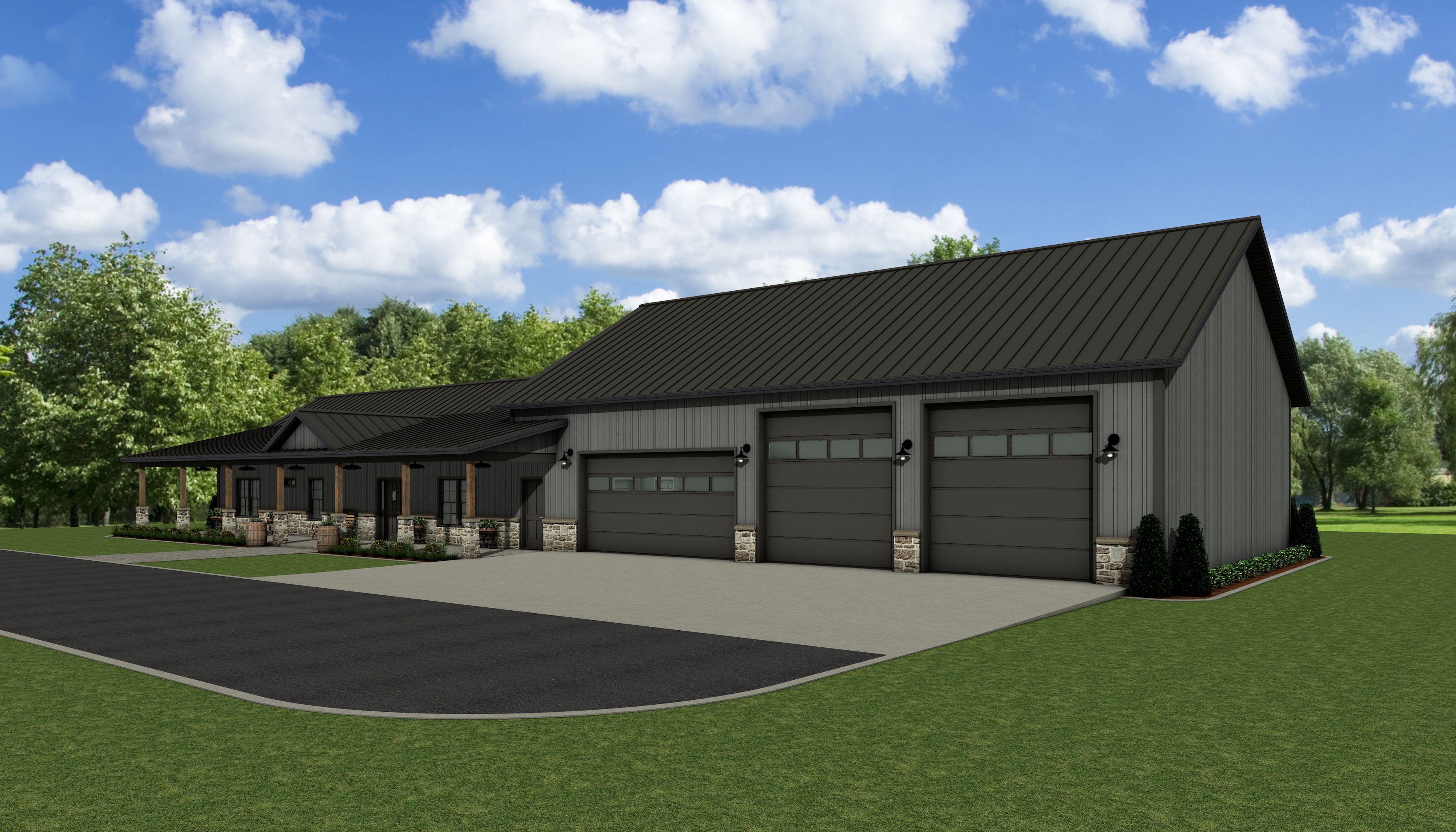 an extremely photo realistic image of a modern house retain the exact structure colors and window arrangement rooflines shiny metal siding foundation height railings wood stain colors and proportions exactly as shown in the reference image integrate into the terrain there are very few trees of mixed hardwoods that are mostly in the distance of the image add warm diffused sunlight with subtle highlights across the siding and grass create ultra realistic lighting with crisp shadows detailed textures in the siding and glass reflections and an overcast sky show only a few lights visible inside render in hyper photo realistic architectural visualization in high quality 8k resolution make it the fall season add realistic landscape around the structure add a large pasture further behind the structure with white 3 rail farm fence in the distance the grass around the structure is mowed add some small landscape bushes and plants around the porch maintain photo realism
