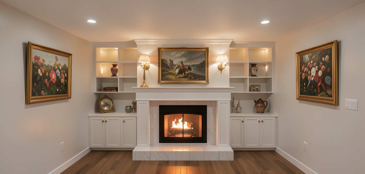 layer 1 geometry authority the uploaded drawing is an architectural elevation and is the authoritative geometry reference for the scene treat the reference drawing as a completed cad model with fixed geometry the architecture is finalized and immutable the renderer may only apply materials lighting and photorealistic rendering while preserving the exact architecture layer 2 project overview custom built in study wall with symmetrical millwork composition consisting of left and right open shelving towers a central upper cabinet with paired doors and a lower base of cabinetry including file drawers and flanking cabinets all annotation text labels and dimensions are removed no text appears anywhere in the scene layer 3 architectural layout full wall built in spanning horizontally with three primary vertical zones left built in shelving tower above a base cabinet center upper cabinet with two large doors above a base of file drawers right built in shelving tower above a base cabinet upper section includes open adjustable shelving on both sides central upper cabinet is recessed slightly within surrounding millwork frame lower section includes continuous toe kick running across entire width maintain exact proportions alignments and spacing from the elevation layer 4 cabinetry and millwork cabinet style flat slab cabinetry all cabinet faces are flat slab panels with smooth uninterrupted surfaces no shaker no frame and panel construction no decorative profiles or added trim left and right towers three open shelving sections above one base cabinet below with hinged doors shelves are evenly spaced and aligned exactly as drawn center upper cabinet two equal width slab doors doors include subtle perimeter reveals matching drawing no added hardware beyond minimal integrated expression base cabinetry central section consists of three file drawer fronts exact widths preserved flanking base cabinets each have double doors toe kick runs continuously and is recessed consistently across all lower cabinetry all panel divisions reveals and alignments must match the drawing exactly layer 5 doors and built ins central upper cabinet doors two large slab doors clean flat faces with precise perimeter gaps maintain exact proportions and symmetry base cabinet doors slab doors with no paneling hinged configuration exactly as shown no additional door styles or reinterpretations allowed layer 6 materials and finishes primary millwork finish rift sawn white oak vertical grain consistency across panels subtle natural variation in tone matte low sheen finish clean contemporary appearance interior shelving matching rift white oak finish toe kick rift white oak to match cabinetry layer 7 lighting design the room has no exterior windows and lighting is entirely artificial lighting includes recessed ceiling downlights evenly washing the millwork soft integrated led strip lighting within open shelving concealed not visible fixtures gentle illumination highlighting wood grain texture lighting temperature warm soft white 2700k 3000k layer 8 mirrors and reflections no mirrors present in this design layer 9 flooring wide plank rift sawn white oak flooring long continuous planks subtle grain variation matte finish slight tonal contrast from cabinetry to maintain visual depth layer 10 camera and composition eye level camera 35 50mm lens centered composition aligned with the middle of the central cabinet straight on elevation perspective balanced architectural framing with full width of built in visible layer 11 rendering realism controls extreme photorealism physically accurate materials ray traced global illumination soft realistic shadows accurate wood grain rendering subtle surface imperfections clean architectural photography style high resolution detail no stylization no illustration effects no artistic reinterpretation